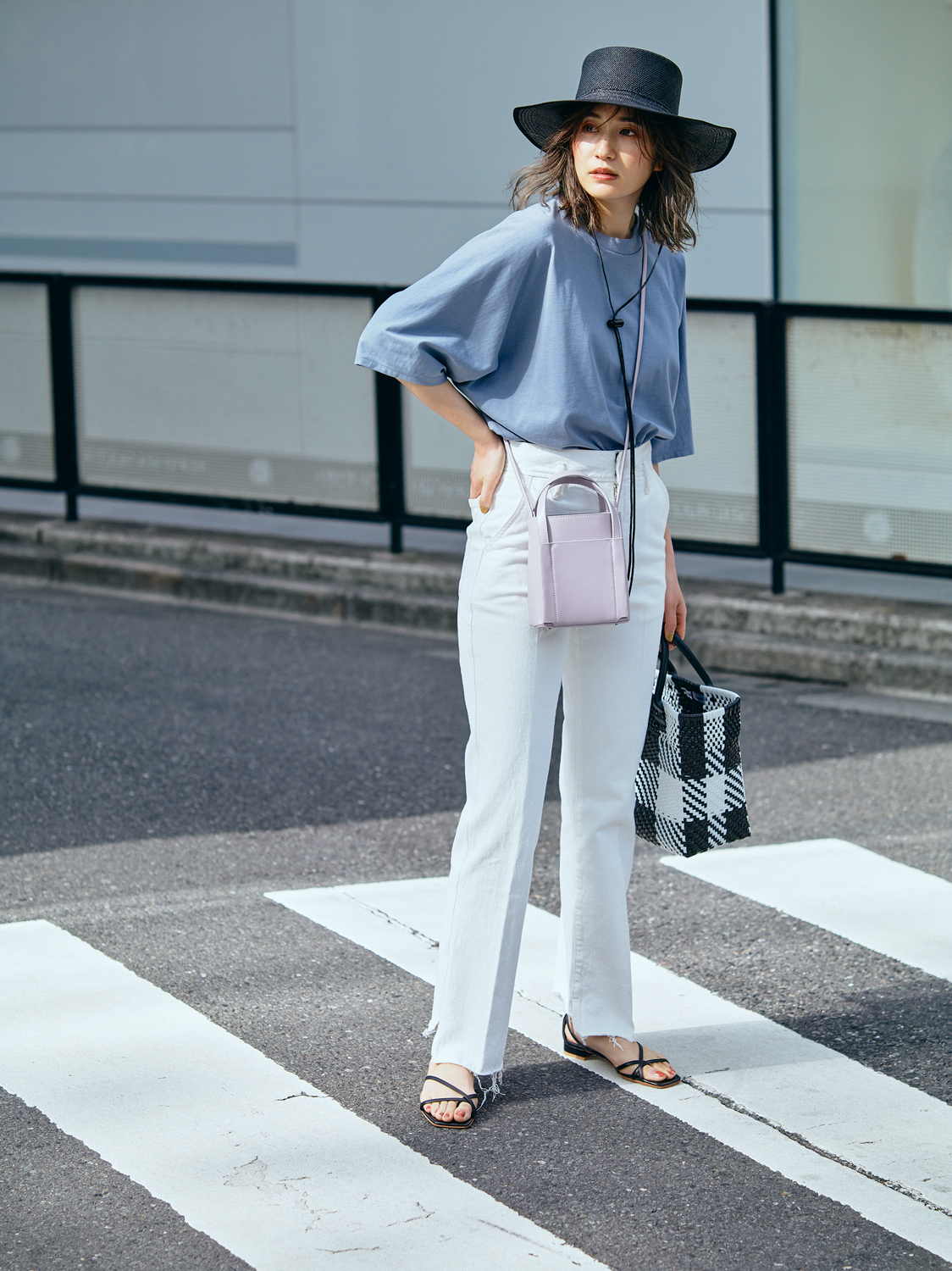 暖色から寒色まで豊富に揃う今季のカラーT。なかでもいち押しは、大人っぽさとこなれ感を備えた“くすみブルー”。ブルーデニムや黒スキニーはもちろん、トレンドのホワイトデニムにも相性抜群。いつものTシャツをこの色に変えるだけで洗練されたムードに!