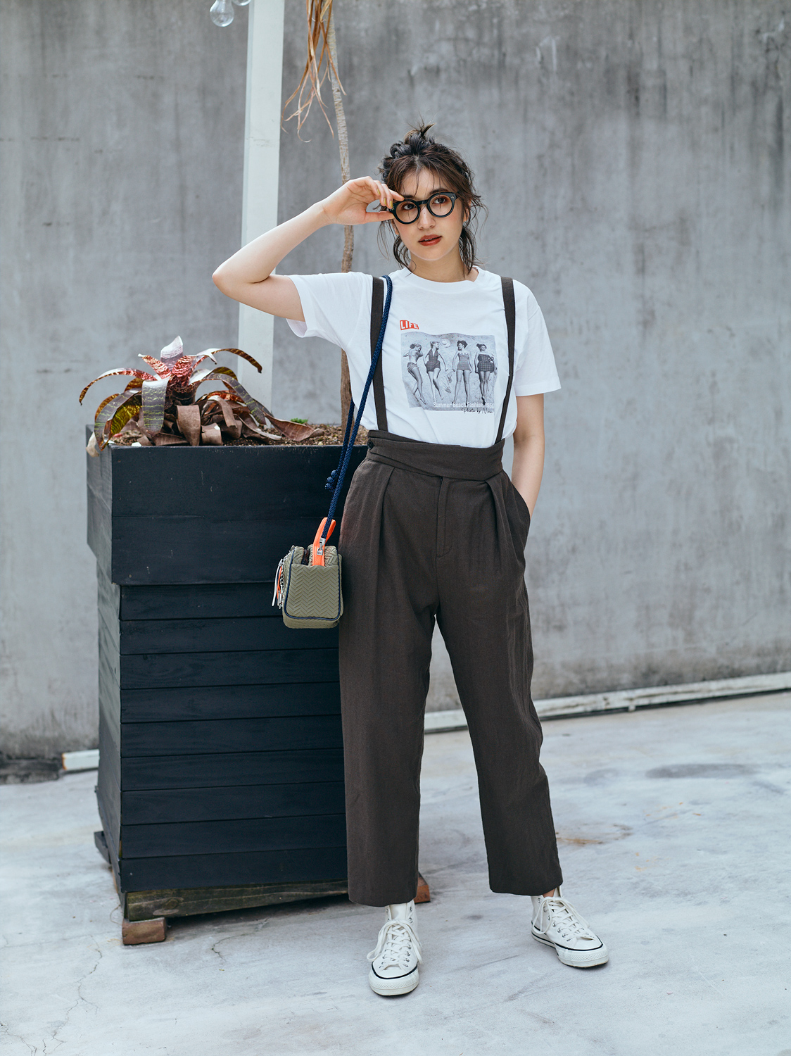 トレンド感満点のフォトT、初心者さんにはコーデに馴染みやすいモノクロタイプがオススメ。色使い控えめのデザインなら定番カラーでもキレイ色でも合わせる色を選ばず、幅広いコーデにフィット。カジュアルすぎないからトレンドのサスペンダーパンツとの着こなしも大人っぽいムードに。