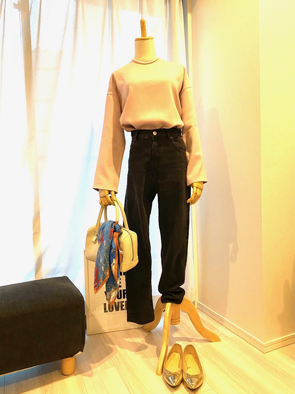 Shose→GU、Tops→MACHATT、Pants→THE NEWHOUSE、Necklace→MIKIMOTO、Bag→BELLMER、Scarf→manipuri