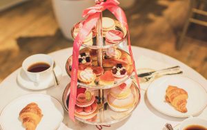 ラデュレのクロワッサンがセットになったスペシャルアフタヌーンティー 「FRED」(¥13,200)。限定マカロンにパティスリー、セイボリー2人分が3段スタンドにずらり。ドリンクはコーヒーと紅茶から選ぶことができます。
