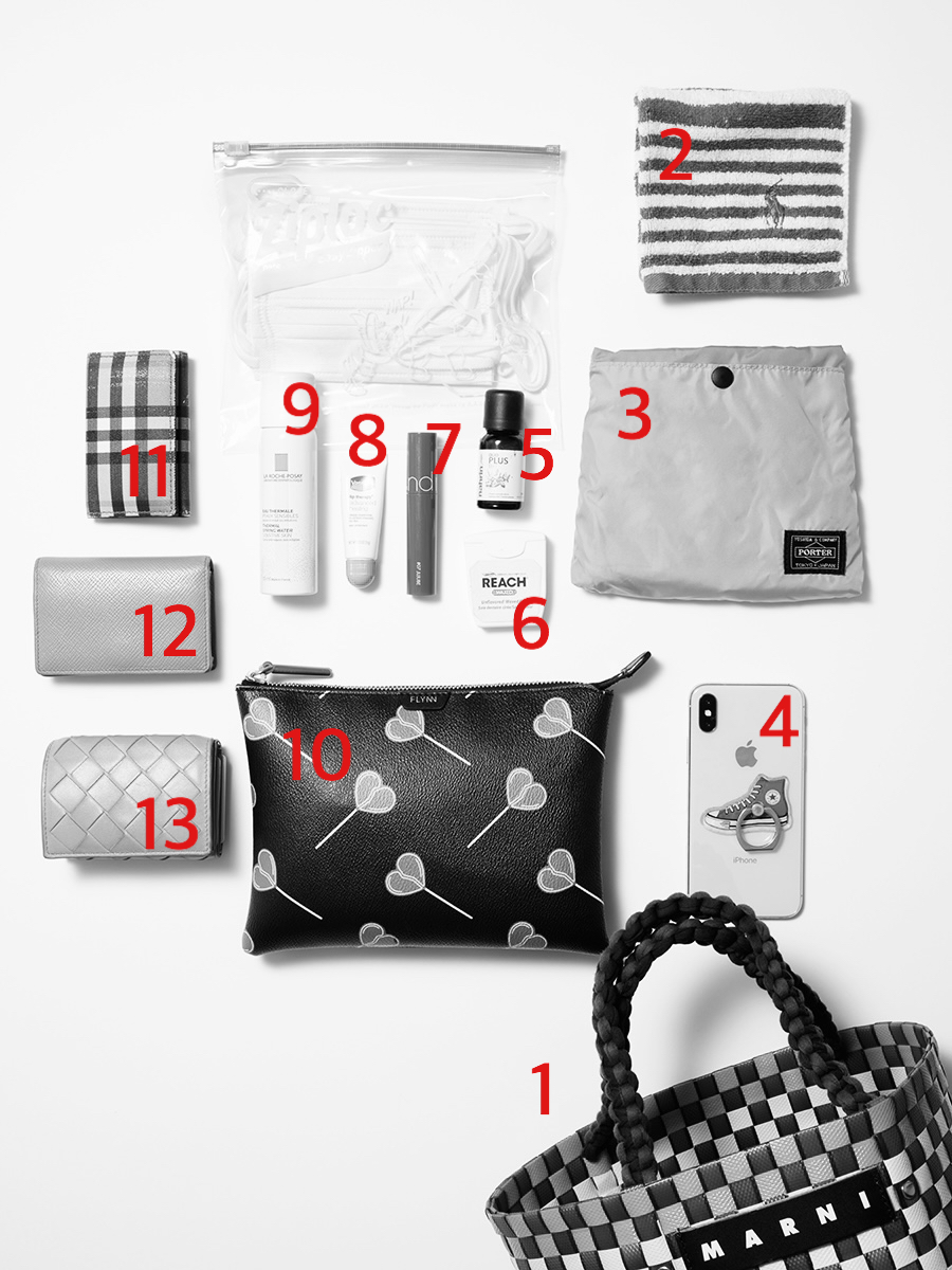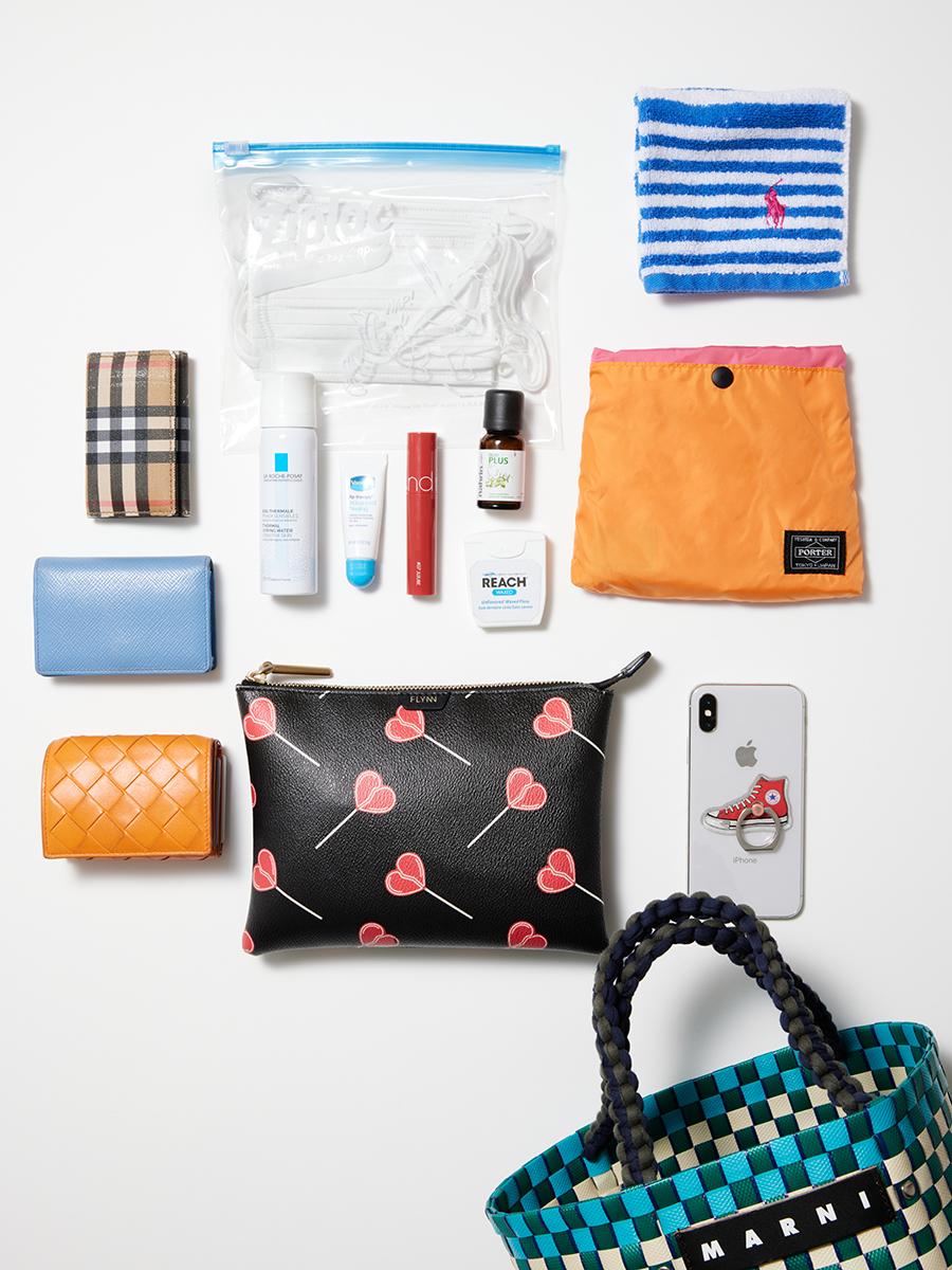 バッグの中身は見た目やデザインはもちろんですが使い勝手が重視。それに大きめバッグの時でもなるべく余計なものは入れず、本当に必要な精鋭アイテムだけを持ち歩くようにしています。小物はプレゼントで頂いたものから、直感で衝動したものまで様々ですが、どれも長く使う派。最近はマスクアイテムやエコバッグを持ち歩くことが多くなりました。