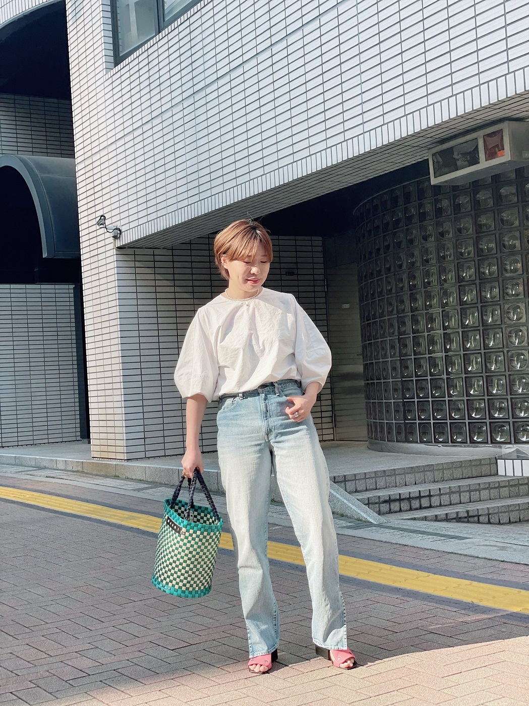 バッグにデザイン性があるのでシンプルなブラウスとデニムのシンプルなカジュアルコーデに。デニムはハイウエストのスリット入りで今っぽいデザインのリーバース。足元はマルニのゴツめのサンダルでハズしを加えて。