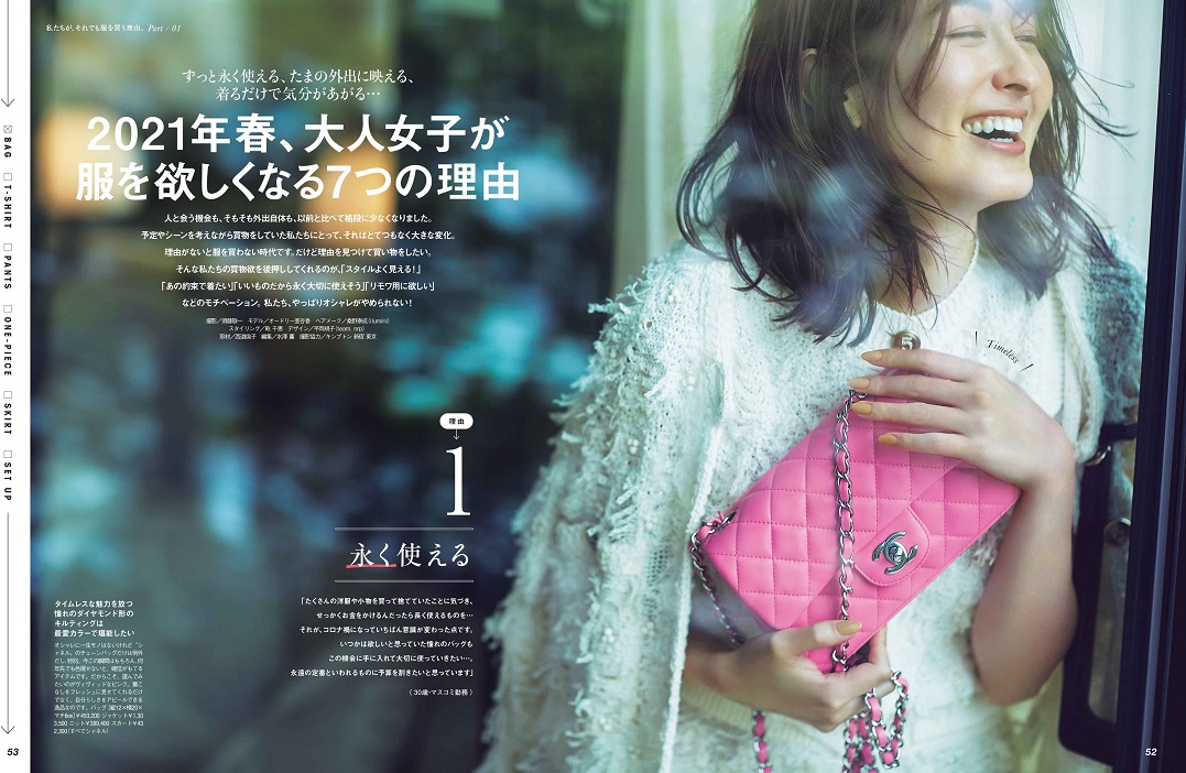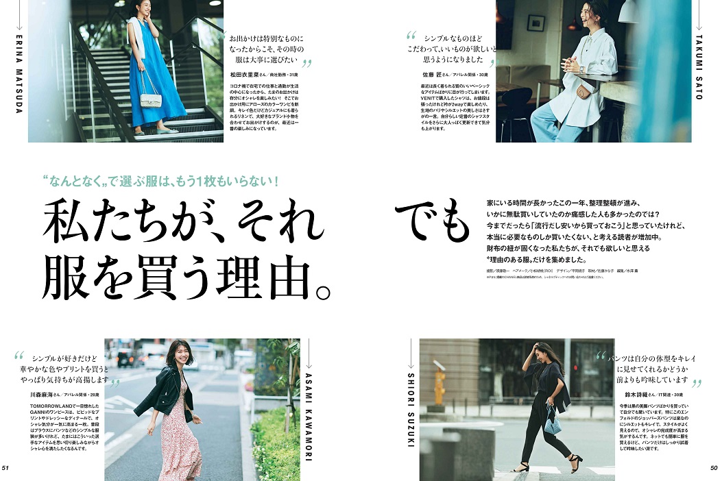 おうち時間が格段に増えて、整理整頓や断捨離も含め、自分のワードローブとじっくり向き合うことになったこの一年。その結果、「やみくもに服を買わなくなった」という声をよく聞きました。季節が変わったからといって“とりあえず”服を買うことをやめた大人女子たちが、どんな理由で服を買っているのか、私たちにとって本当に必要な服ってなんだろう?…そんな疑問に答える大特集です。
