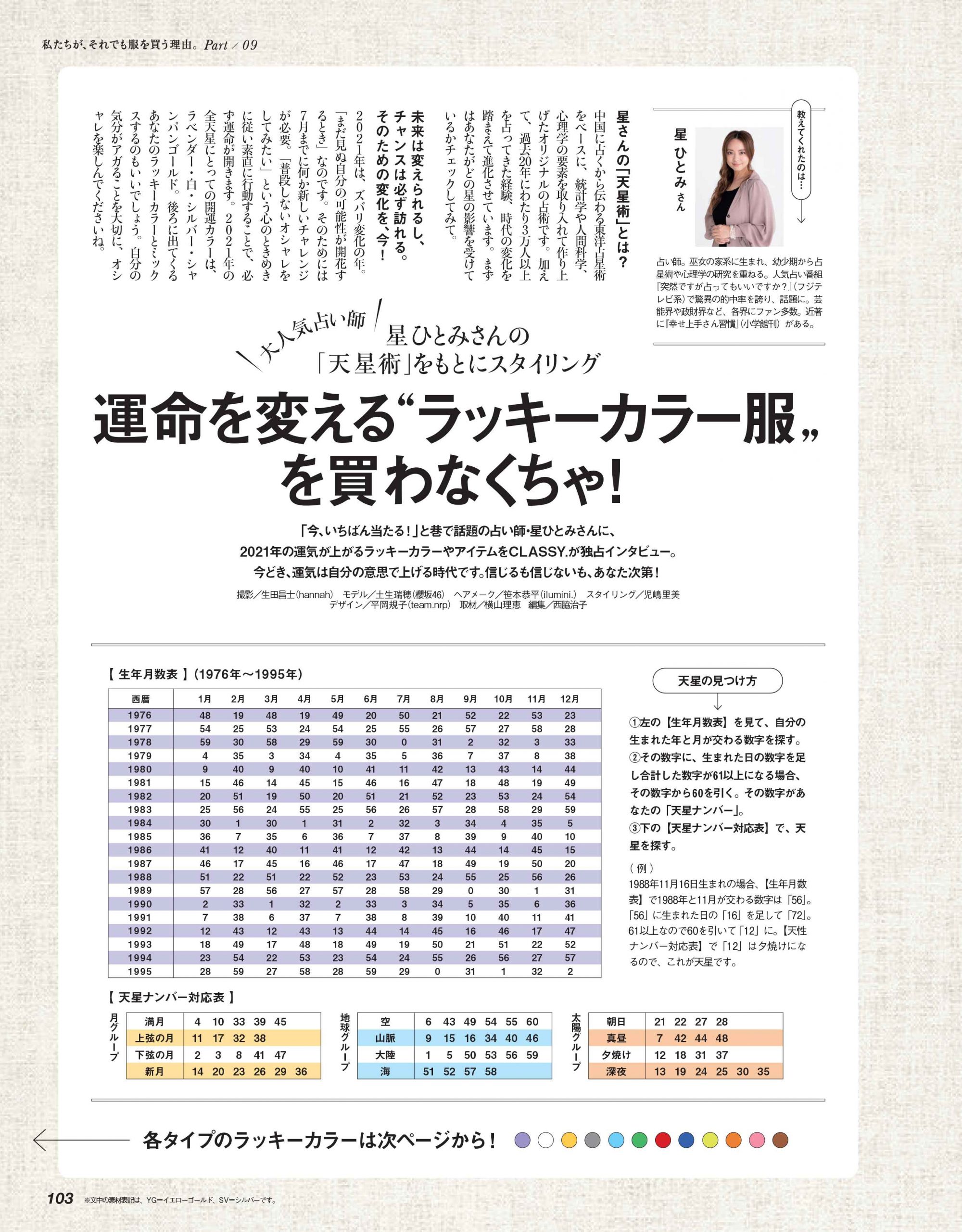 「今、いちばん当たる」と巷で話題の人気占い師・星 ひとみさんがCLASSY.に初登場!オリジナルの「天星術」をもとに、12の天星それぞれの[ラッキーカラー⇒ラッキーなオシャレ]を導き出しました。みなさん、各々のラッキーカラー服を手に入れて、残りの2021年の運気を最大限にアップさせちゃってください!