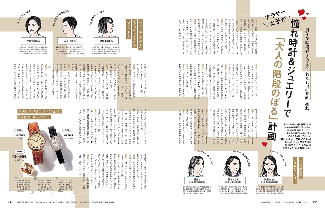 いつでもスマホで時間が見られても、アップルウォッチが流行っても、一生ものの腕時計、そしてジュエリーは永遠の憧れ。「30代になって雷に打たれたように突然、いい時計とジュエリーが欲しくなった!」という最年少編集部員Jが、自身の欲望に忠実に企画立案。「素敵な時計やジュエリーに出合って、素敵な大人になりたい!」というストレートな願望は、CLASSY.世代のみなさんも、きっと共感できるはず。