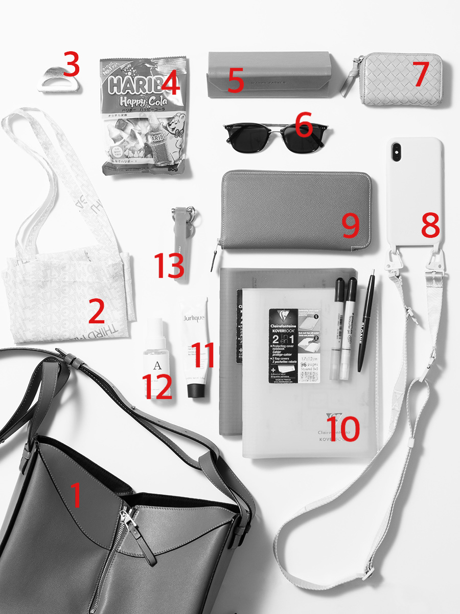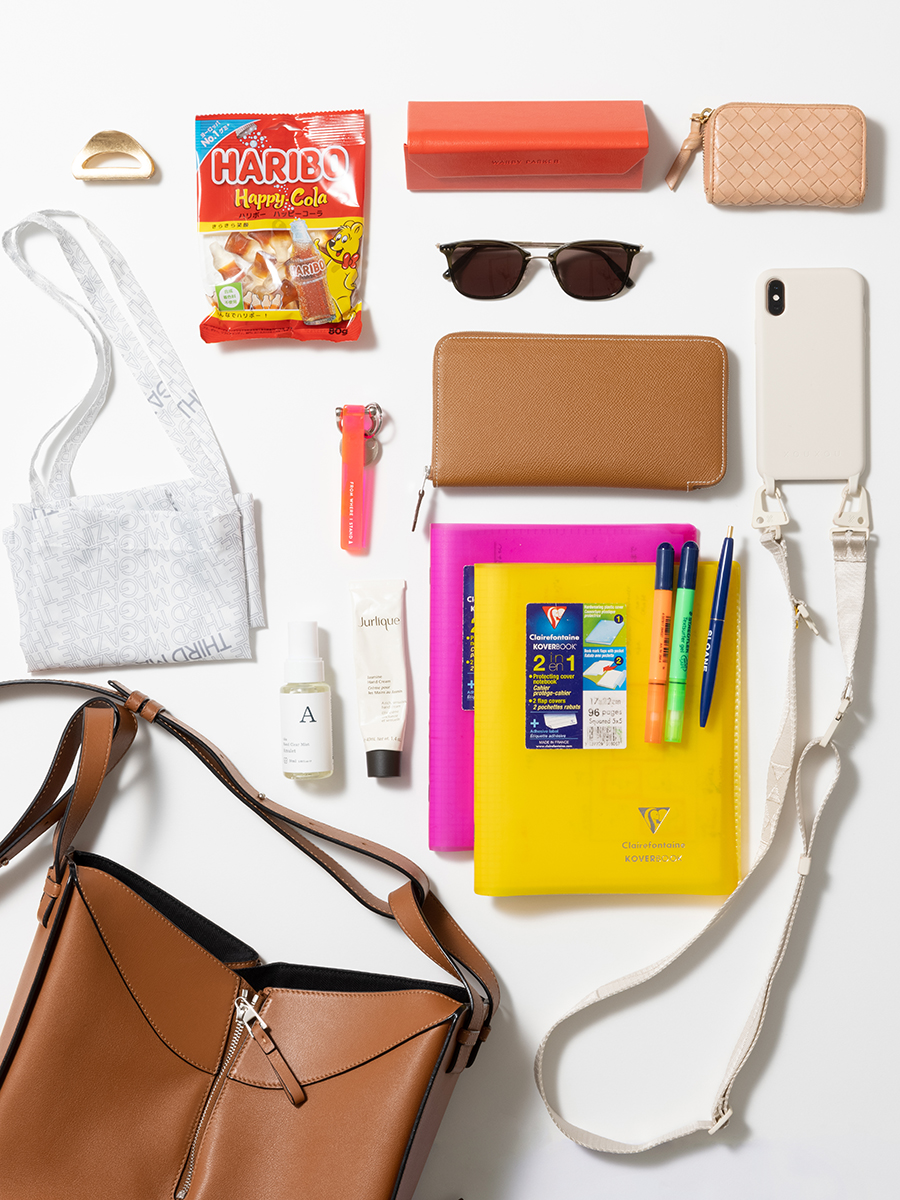 ① 2年前に日本の百貨店で買ったロエベのハンモックはカジュアルにもきれいめにも合うタンカラーをセレクト。コーデによって変形させて持つことができるし、口が大きく開くので荷物が迷子にならないので使いやすいんです。