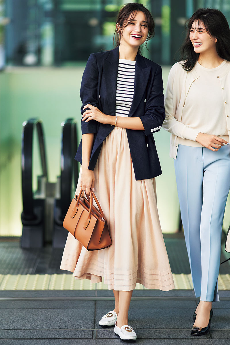 かっちりジャケットに〝柔らかスカート〞で優しい先輩感を演出