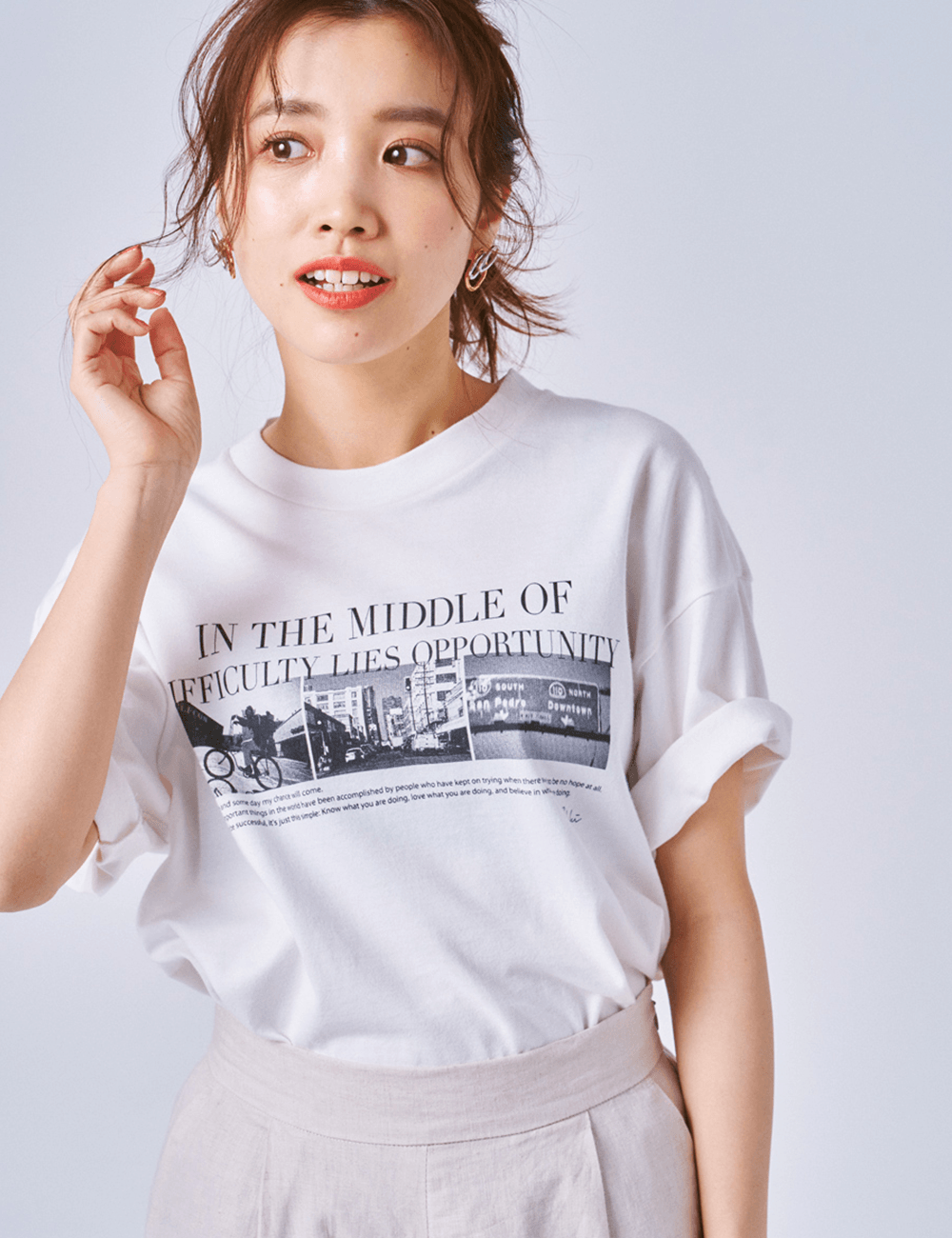 メンズテイストやミリタリー、古着からインスパイアを受け、女性らしいデザインを提案するブランド「+81 BRANCA」。シックなモノクロフォト&レタリングのプリントデザインは、コーディネートを選ばずに着こなせます。ゆったりシルエットなので、袖を折って着るとバランスUPも狙えそう。