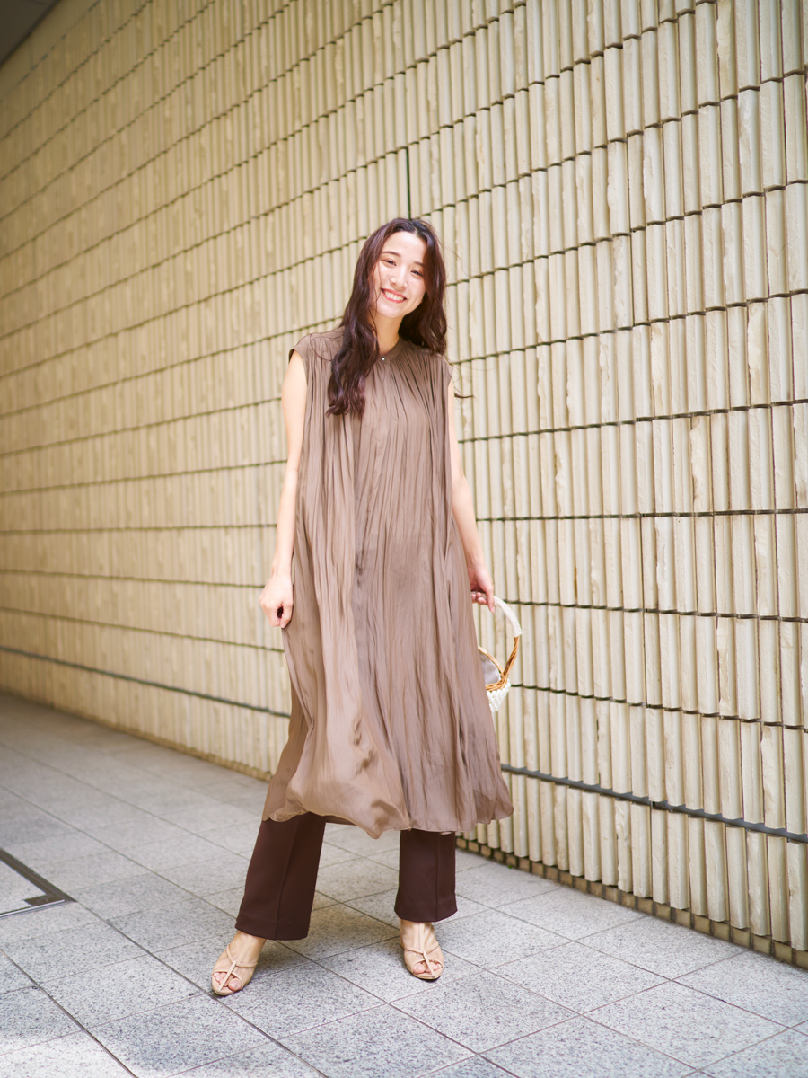 「夏に着るブラウンは抜け感があって好きなんです。今回はワンピースに同色のパンツをレイヤードして、ワントーンコーデにしてみました! ワンピースはたっぷり入った細かいギャザーが上品に見せてくれます」