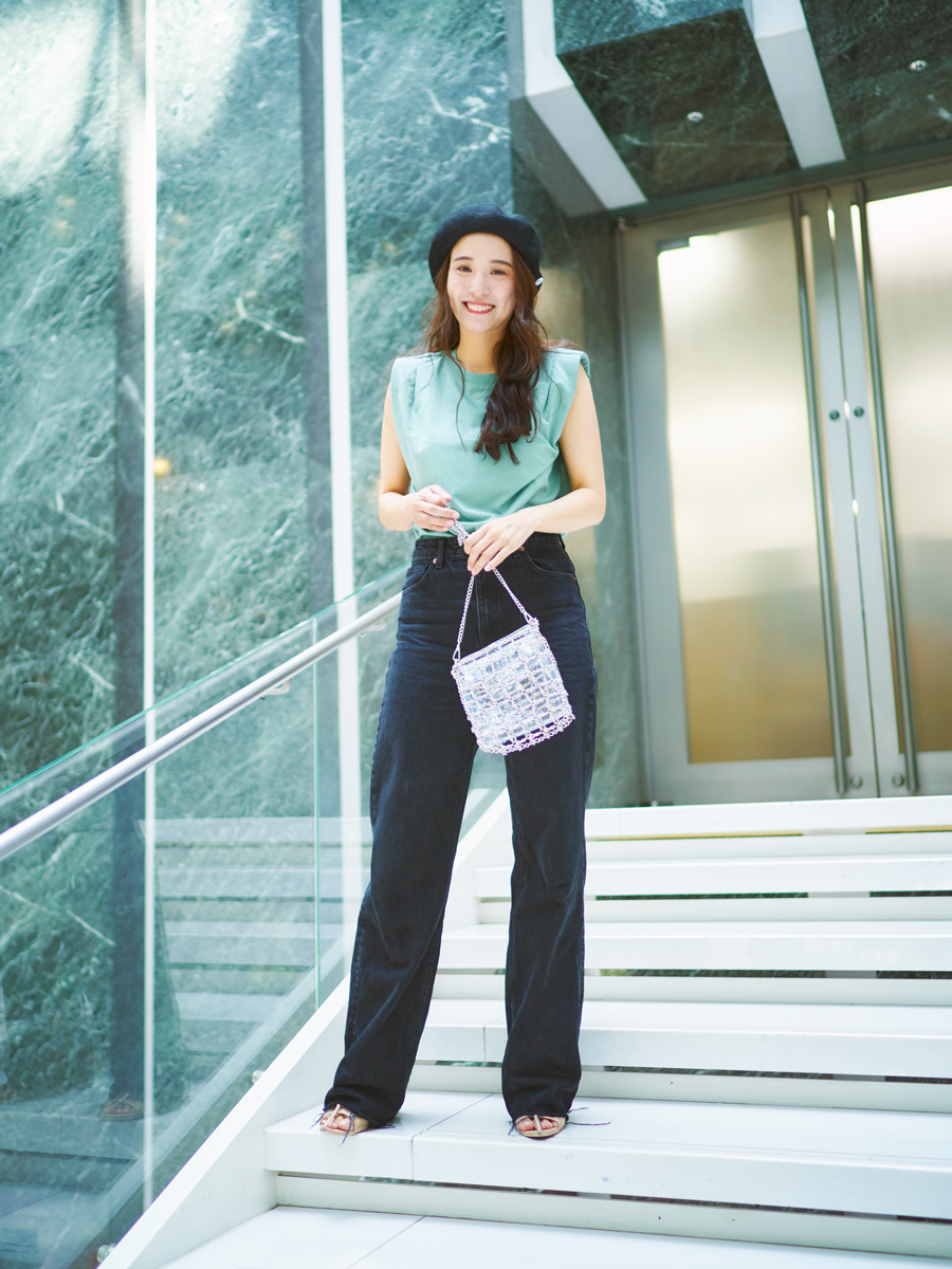 「さりげないショルダーパッドのアクセントで、シンプルなワンツーコーデも決まります。目線が上に上がるので、全体的にキレイなシルエットで着られました。生地もサラサラで気持ち良く、夏に活躍しそう!」
