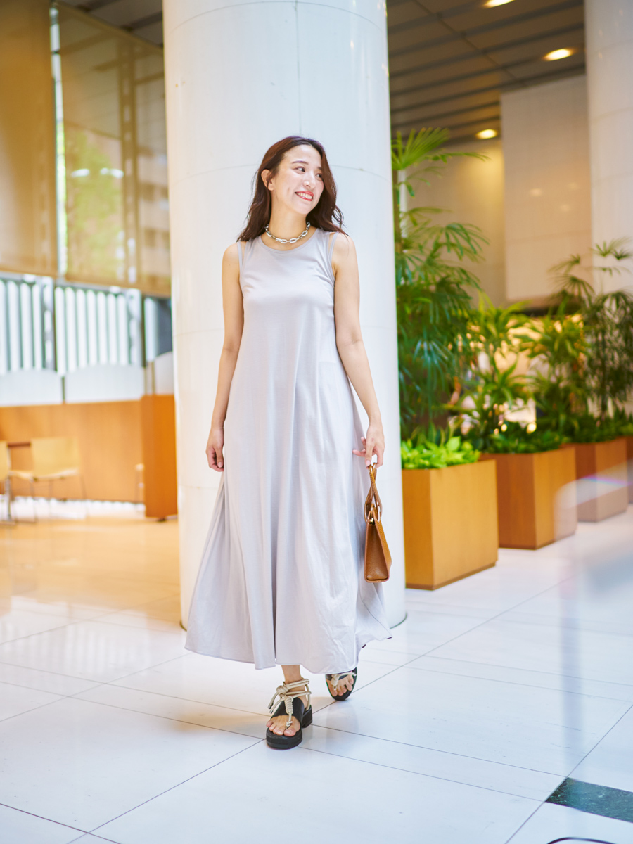 「さらっと心地良く着られるシンプルなワンピースですが、肩のダブルストラップのワンポイントで女性らしさがぐっと増します♡ ボリューム感のあるサンダルとシルバーアクセで、今回は少しカジュアルに合わせてみました」