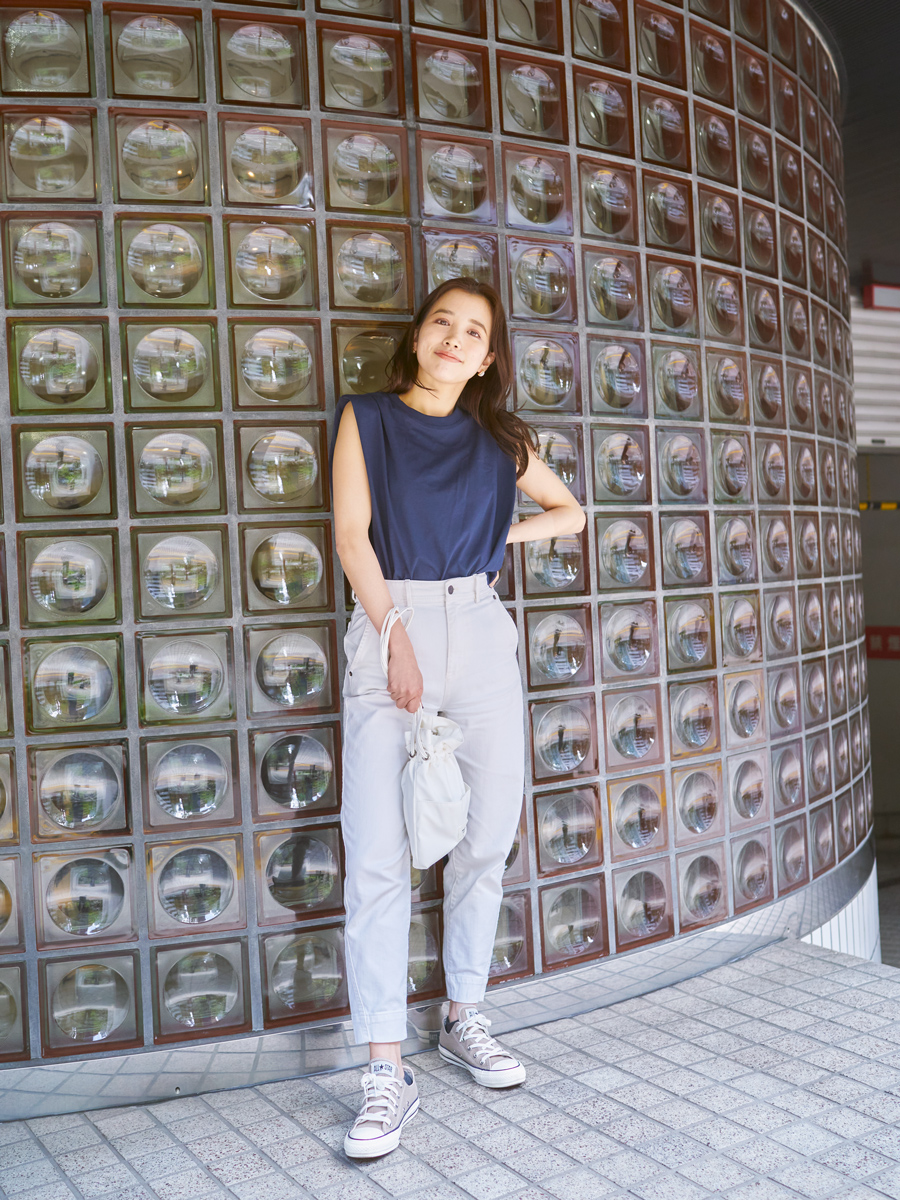 「主張しすぎない自然なショルダーパッドで、ノースリを着た時に華奢見えするのが嬉しい! ネイビー×白の組み合わせで、夏らしく爽やかに仕上げました。最近シンプルなデニムをよく穿くようになったので、ひとクセあるトップスはかなり使えそうです」