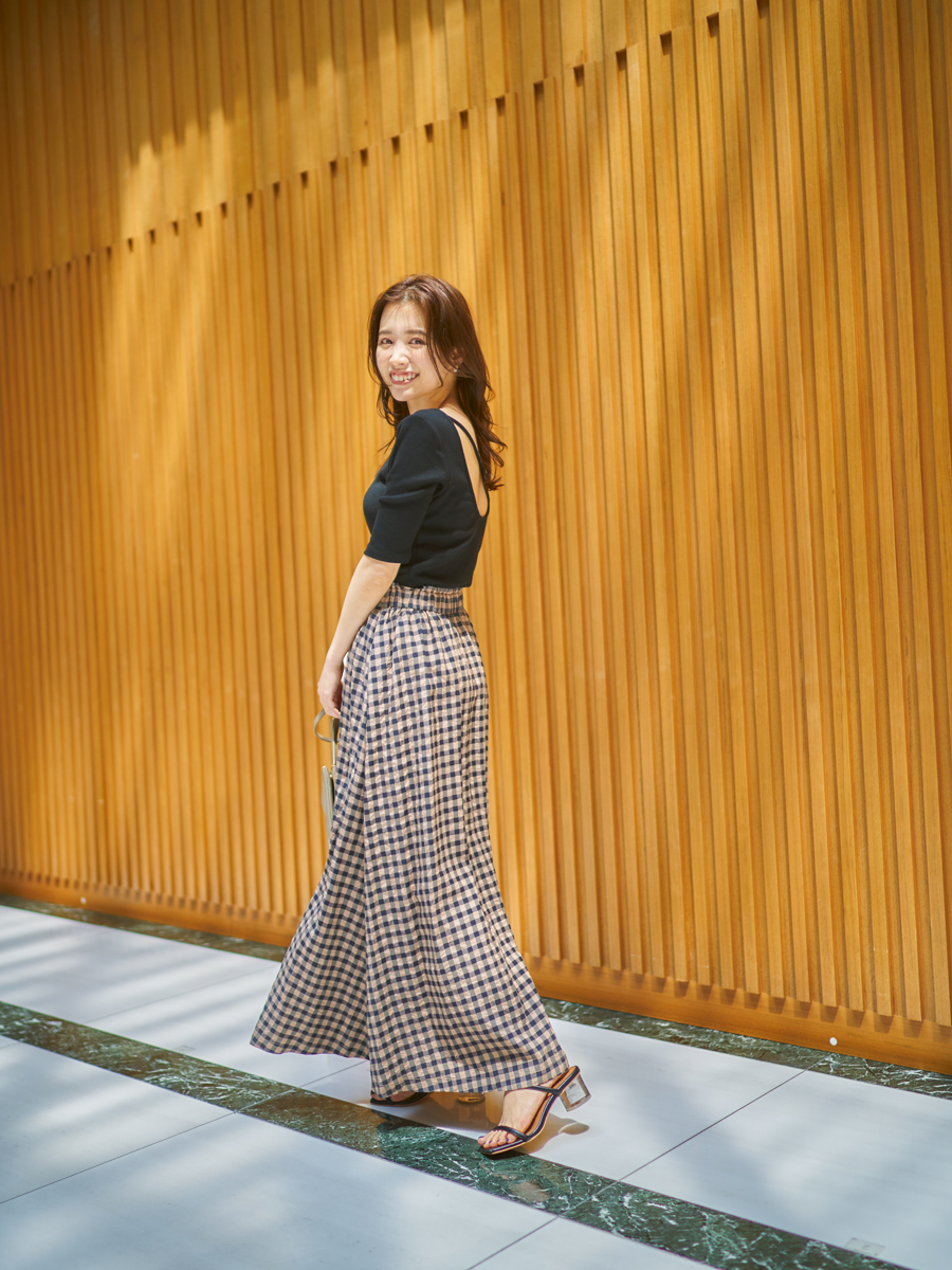 「幼く見えがちなチェック柄ですが、このブロックチェックはブラウン×ブラックで落ち着いた配色なので大人も取り入れやすそう。晩夏にも着られそうな色みです。今回はトップスも黒にして、全体を引き締めました。涼しくて快適です!」