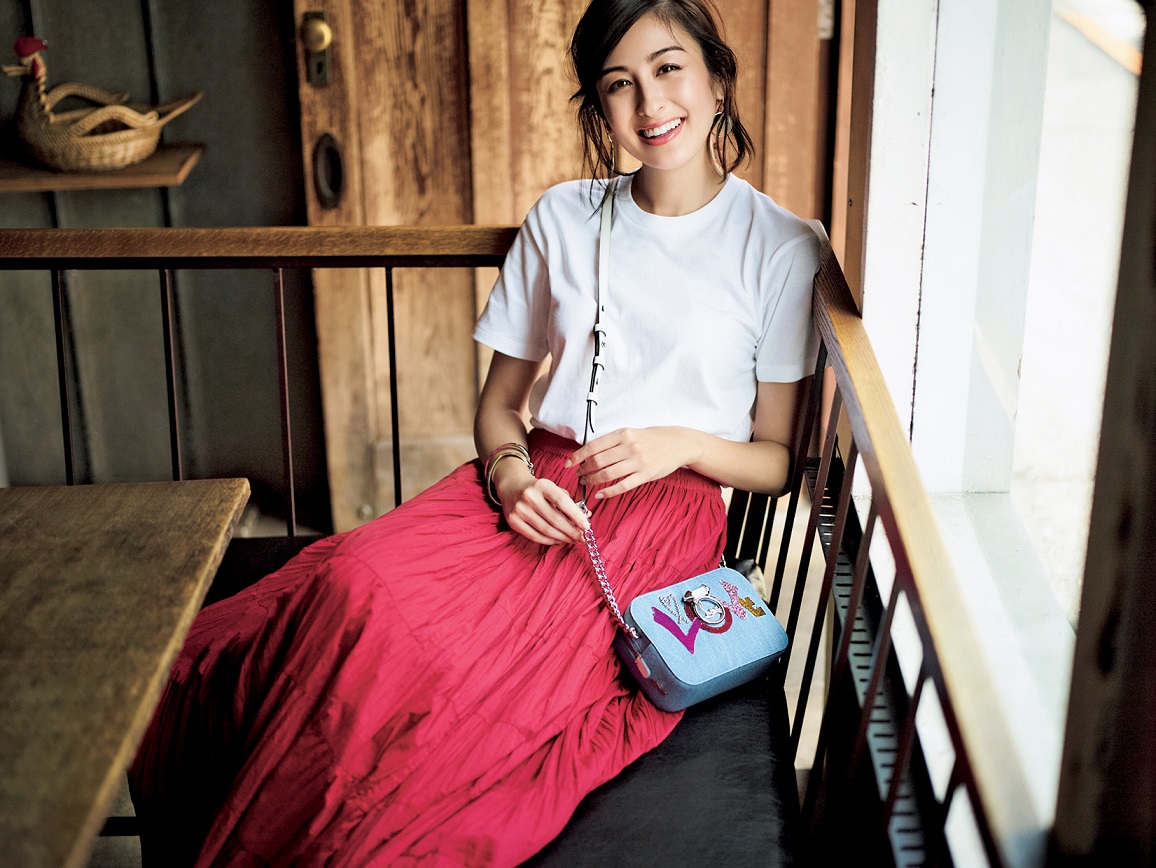 クルーネックTシャツ[VネックTシャツ、ノースリーブカットソーとセット]¥3,500(ヘインズ/フレームワーク ルミネ新宿店)スカート¥21,000(マリハ/ショールーム セッション)バッグ¥129,000(クリスチャン ルブタン/クリスチャン ルブタン ジャパン)ピアス¥4,000バングル[太]¥8,000[細]¥7,000(すべてアビステ)
