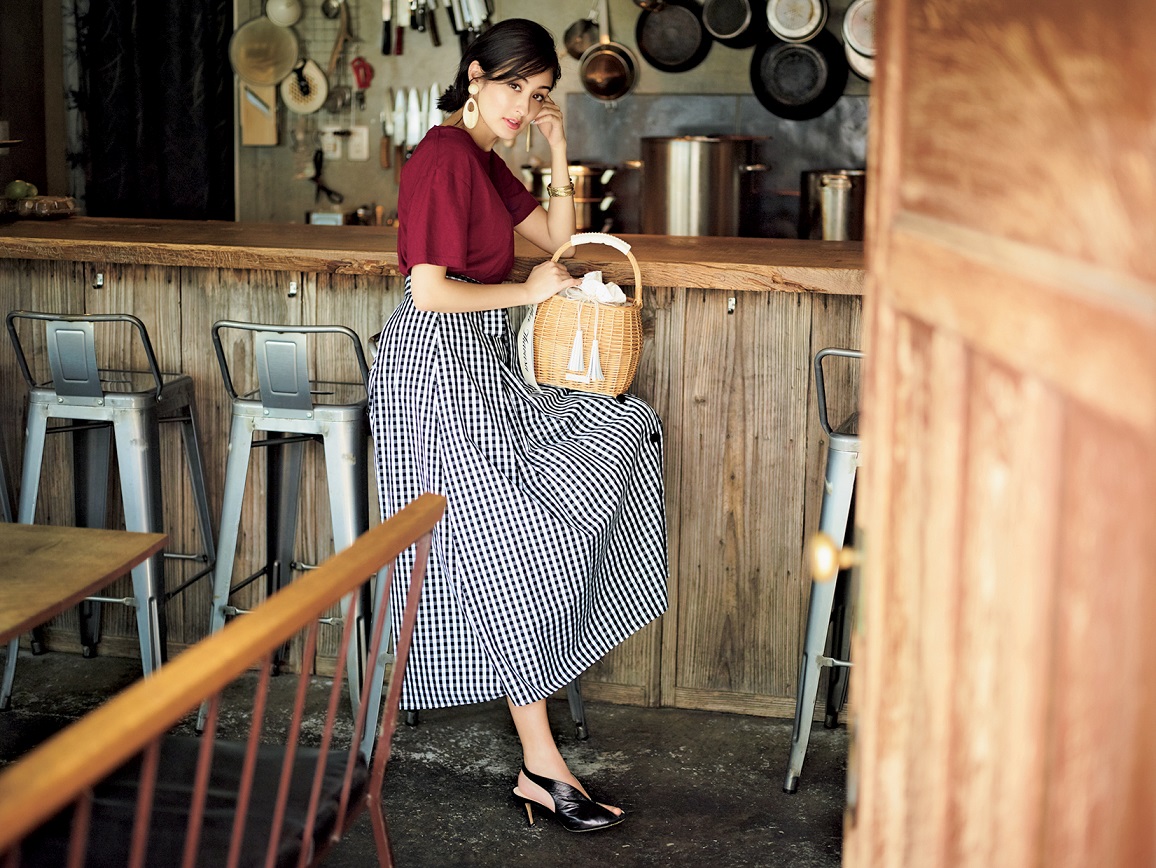 クルーネックTシャツ¥3,500(ヘインズ/ユナイテッドアローズ 銀座店)チェックスカート[共布ベルト付き]¥27,000(ルル・ウィルビー/アルアバイル)カゴバッグ¥19,000(サマンサタバサ/サマンサタバサ ルミネ新宿店)サンダル¥46,000(ネブローニ/フラッパーズ)イヤリング¥7,778バングル¥4,000(ともにアビステ)