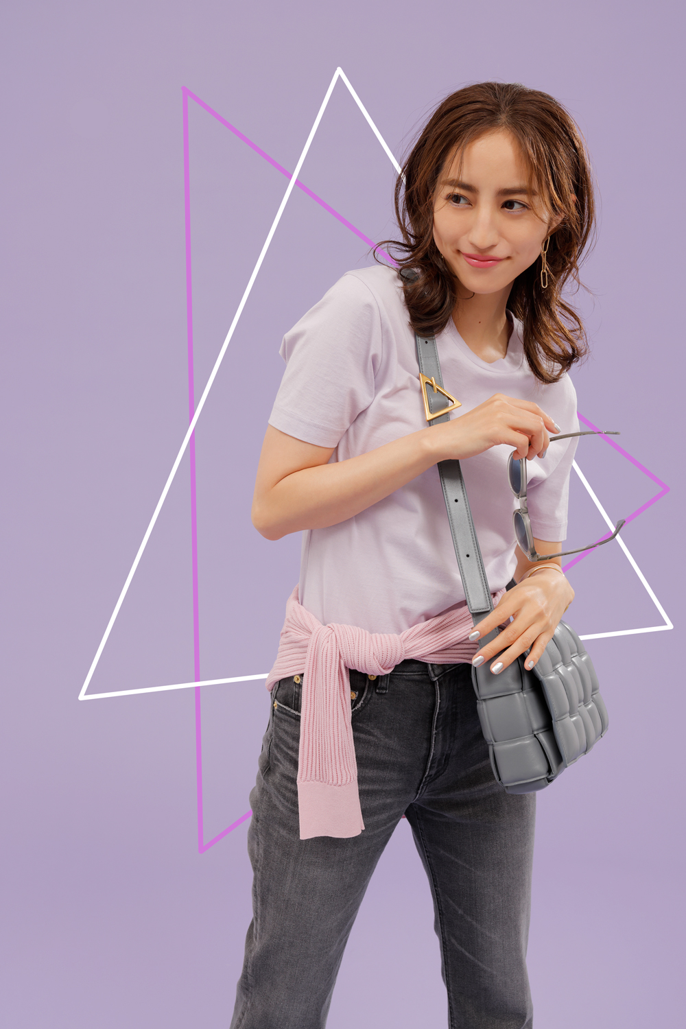 CLASSY.世代のスタメン服であるTシャツとデニム。白T×ブルーデニムから一歩進みたいこの夏は、カラーT×グレーデニムが一推し。今年らしいラベンダーを取り入れたニュアンスカラーの着こなしに、ボッテガ・ヴェネタのシグネチャーであるイントレチャートやストラップのトライアングルバックルを効かせて。「パデッド カセット」の新色グレーなら、キレイ色コーデにも相性抜群。女らしくてリッチなカジュアルスタイルに。