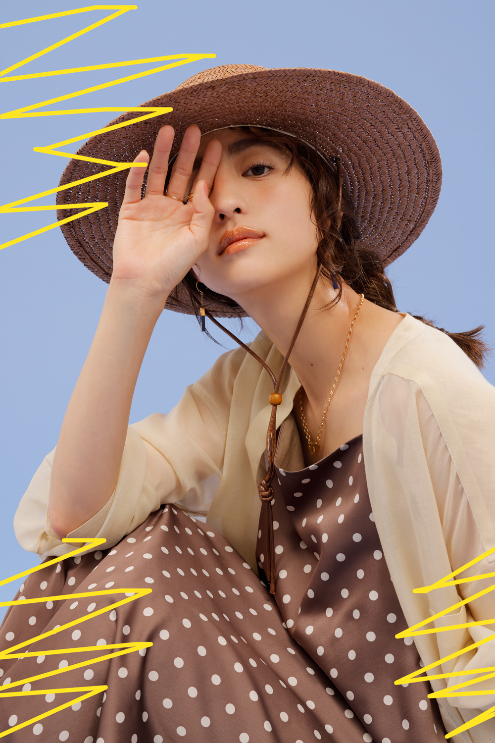 バンドカラーシアーブラウス¥13,200ドットキャミソールワンピース¥17,600(ともにマドモアゼル ロペ)サンダル¥41,800<MIISTA>帽子¥13,750<Lack of Color>(ともにジャック・オブ・オール・トレーズ プレスルーム)左耳ピアス¥55,000右耳ピアス¥50,600ネックレス¥297,000右手人差し指リング¥173,000中指リング¥85,800(すべてトーカティブ)