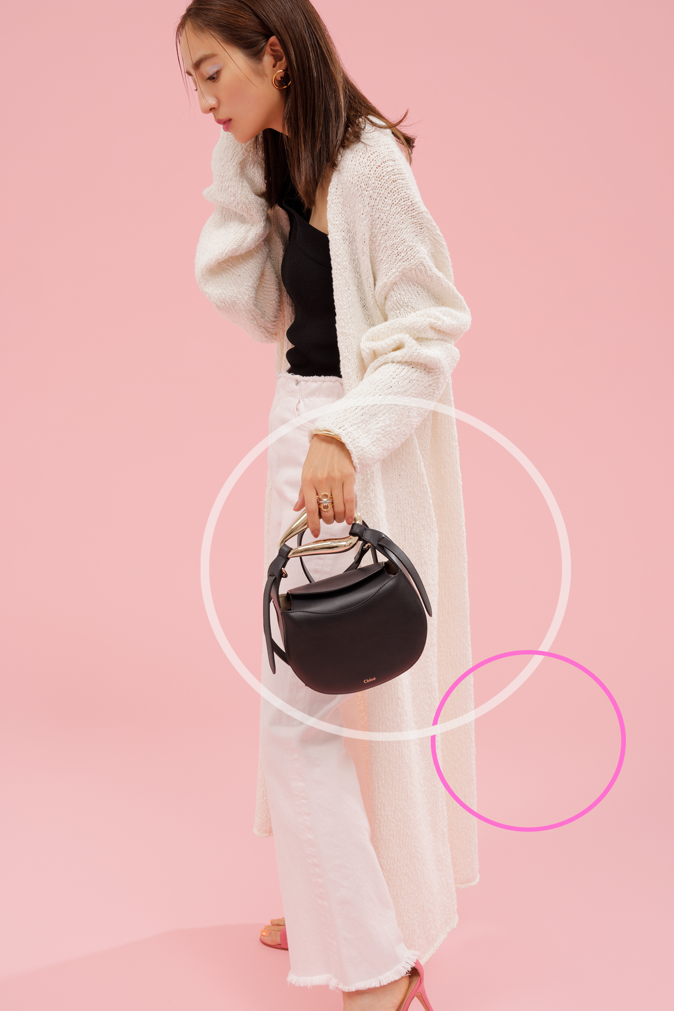 心地いい風に初夏の訪れを感じる5月。今季トレンドのカッティングトップスで作る肌見せスタイルは、初夏こそ取り入れたい着こなしのひとつ。モードなトップスに、ペールピンクのデニムやゆるっとカーデで女らしさをプラス。仕上げに構築的な「KISS」バッグで辛口なエッセンスを加えれば、カジュアルになりすぎずスタイリッシュな肌見せコーデに。