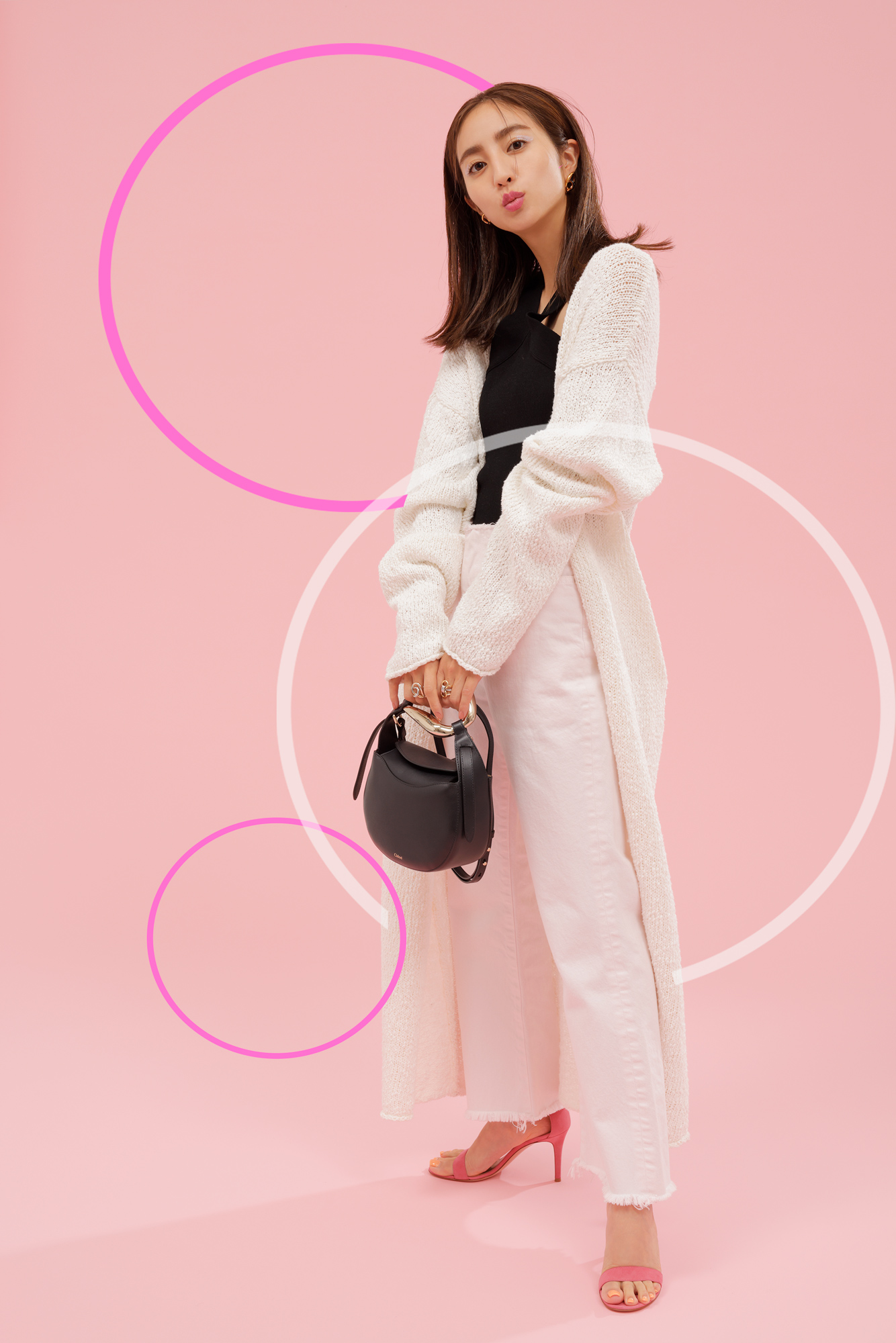 ロングカーディガン※EC限定品¥20,900カットオフデニム¥23,100(ともにウィム ガゼット/ウィム ガゼット ルミネ新宿店)ニットキャミボディスーツ¥110,000(ケイト/ザ ストア バイシー 代官山店)サンダル¥104,500(ジャンヴィト ロッシ/ジャンヴィト ロッシ ジャパン)左耳ピアス※シングル¥42,000右耳ピアス※ペア¥57,000左手リング¥82,500右手リング¥85,800(すべてシャルロット シェネ/エドストローム オフィス)