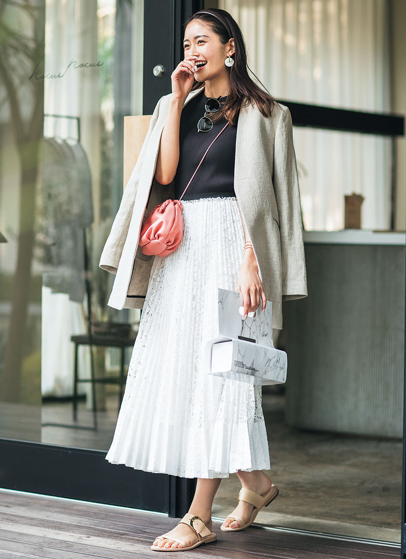 華やかレースをリネンジャケットがデイリー仕様にこなれて見せる