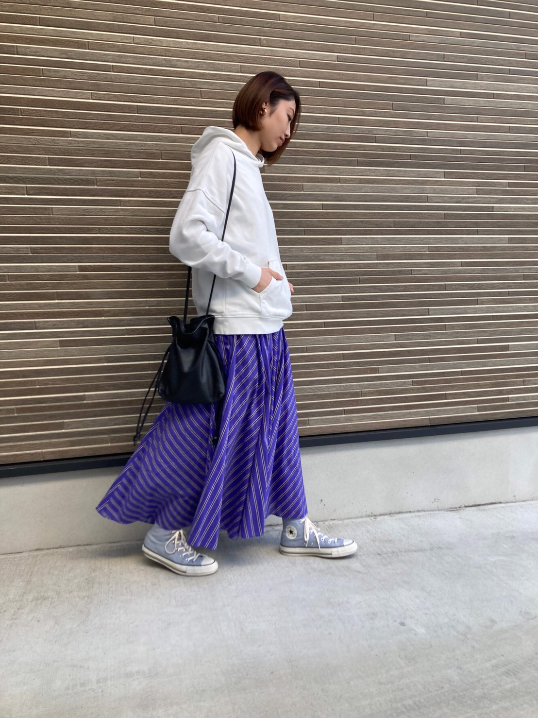 「パープルのスカートを合わせた色×色コーデ。カラーコンバースの日は、寒色なら寒色同士、と色の系統を合わせるとちぐはぐな印象にならず、まとまりやすいです」
