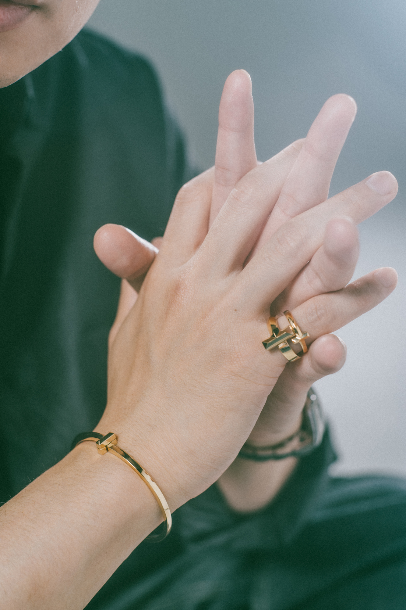 中村さんの手元で輝くのは、クリーンなきらめきを放つ“ナロー リング”、大胆で力強い存在感の“ワイド リング”、途切れることのないサークルが手元を優美に囲む“ヒンジ バングル”。自由に自分らしく——。ティファニーのアイコンである「T」を再構築し、エッジが際立つカットを施したTモチーフは、ボーダーレスにまとえるのも魅力。