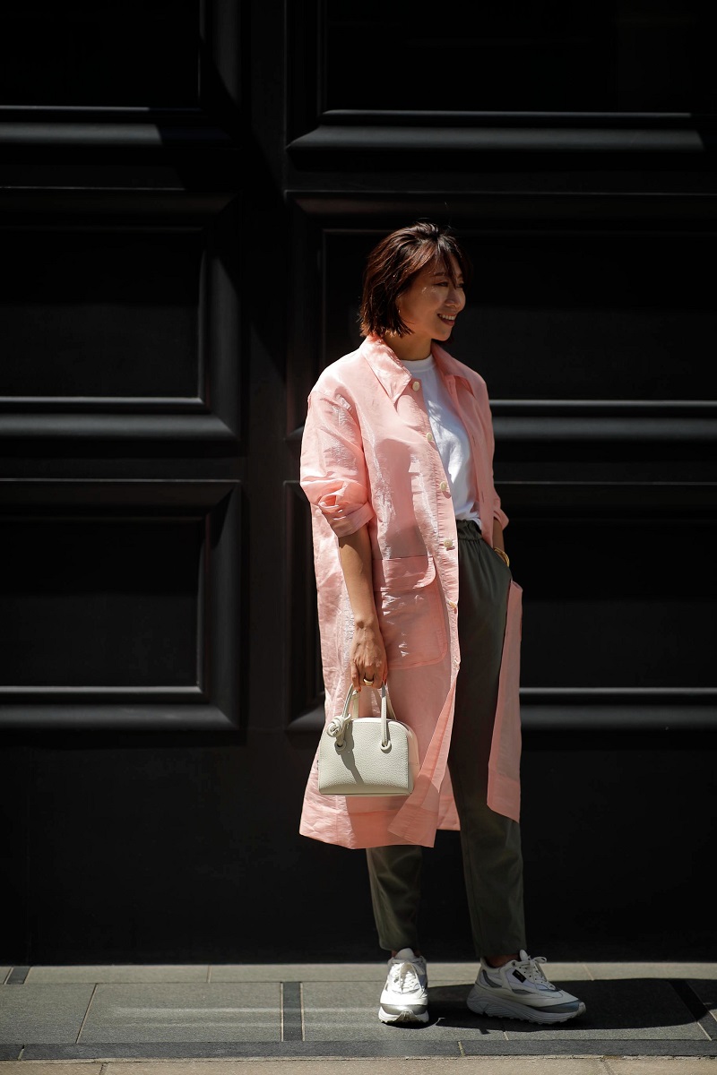 透け感のあるピンクのジャケットは、光沢感があるので合わせ方次第でエレガンスにも転びやすいので、思い切ってスポーティーなパンツ&スニーカーを投入。カーキやブラウンなどこっくりしたカラーと合わせるピンクが好きです。
