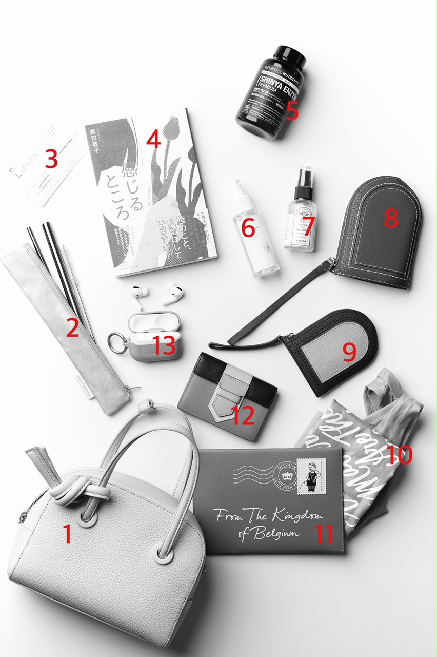 毎年頑張った自分へのご褒美に1つずつ集め始めたの“DELVAUX”の小物たちは出すたびに気分を上げてくれるアイテム。そして学びを深めているサステブル&エシカルなアイテムと、膣ケアアイテムは、会った人との会話のタネにもなるので必ず忍ばせています。