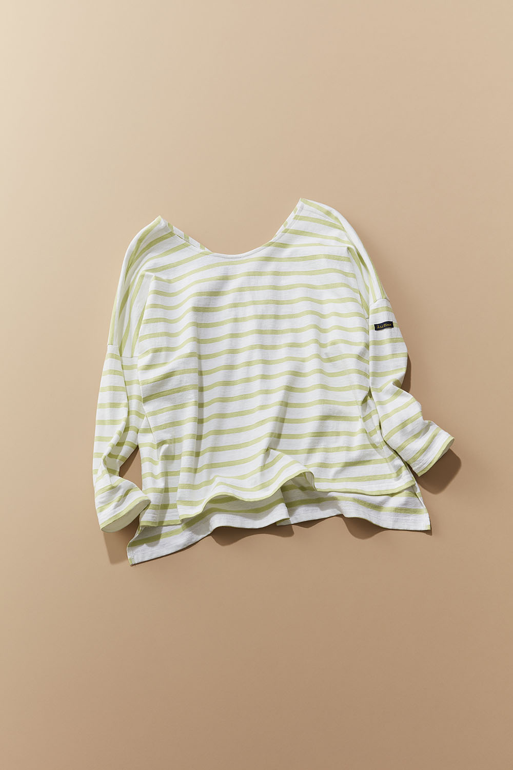 ボーダーの代名詞といえば1936年に仏・ブルターニュ地方で創業した老舗のルミノア。ベーシックながらも流行をほどよく取り入れた幅広く楽しめるカラーやモデルを数多く展開。特に「ENCOLURE A」は、後ろVカットにゆったりとしたドロップショルダーで旬のリラクシーな印象に。腕や肩周りが気になる方にも着やすいのも特徴。カットソー¥14,300(ルミノア/ゲストリスト)
