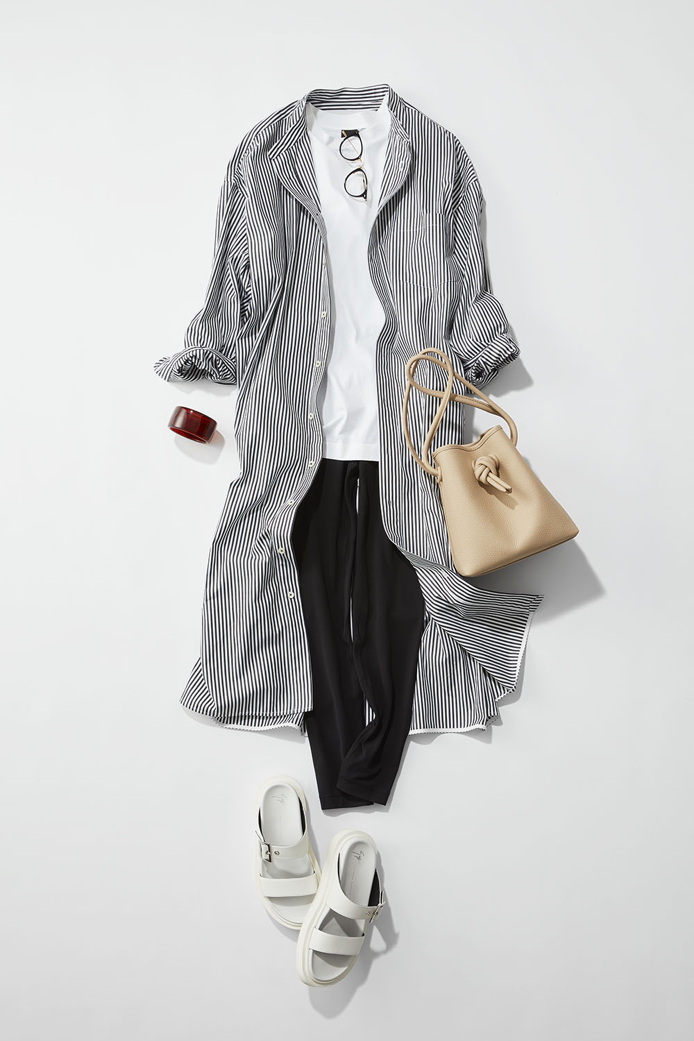 レギンス¥14,200(lululemon)シャツ¥29,700(ティッカ)Tシャツ¥13,200(エイトン/エイトン青山)バッグ¥40,700(ヴァジック/ガリャルダガランテ 表参道店)サンダル¥85,800(ジュゼッペザノッティ/アパルトモン 青山店)バングル¥4,200(アビステ)
