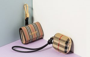 バーバリーらしさを感じさせるパターンが目を引くAirPodsケース。環境に配慮したキャンバス素材にアイコンストライプをプリントしたチャーム型(左)と、長めのレザーストラップが今っぽいヴィンテージチェック柄(右)、どちらがお好み?
