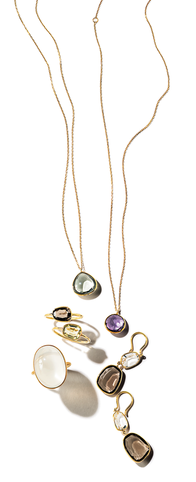 「愛用しているマリハの天然石ジュエリーは、夏にぴったり。女性だけが楽しめる、まさに特権と言えるアイテムだと思います」〈上から〉ネックレス〈グリーンアメシスト〉¥52,000ネックレス〈アメシスト〉¥54,000リング〈スモーキークォーツ〉¥72,000リング〈レモンクォーツ〉¥72,000リング〈ムーンストーン〉¥295,000ピアス〈クリスタル×スモーキークォーツ〉¥98,000(すべてマリハ/ショールーム セッション)