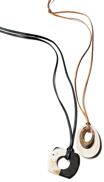 「ナチュラルなレザー小物は昔から大好き。コーデがちょっと物足りないときに活躍します」〈右から〉ベージュ×ゴールドネックレス¥22,000ブラック×ホワイトネックレス¥ 10,000(ともにキャッツ/バーニーズ ニューヨーク カスタマーセンター)