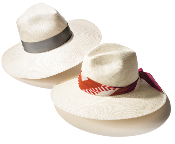 「女優帽まではいかないけれど、ブリム(つば)は狭いよりも広めなほうがエレガ ント」〈右から〉柄テープハット¥47,000(ボルサリーノ/ビームス ハウス 六本木) グレーテープハット¥55,000(ボルサリーノ/ボルサリーノ ジャパン)