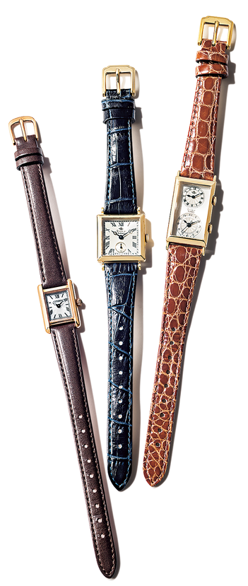 「腕時計は華奢なタイプが大前提。他の小物と組合せても邪魔しない、アンティークなムードのデザインが使えます」〈右から〉ブラウン型押しベルト時計¥44,500ネイビーベルト時計¥24,000(ともにロゼモン/ピークス)ダークブラウンベルト時計 ¥25,000(シチズン キー/シチズンお客様時計相談室)
