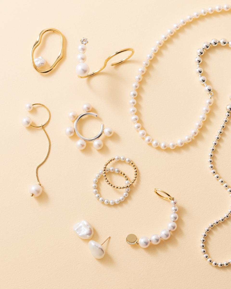 6つのパールが均一に並んだイヤーカフ。カジュアルなピアスと組み合わせてデイリーに活躍させたい。(片耳)イヤーカフ〈SV×淡水パール〉¥22,000(e.m./e.m.表参道店)