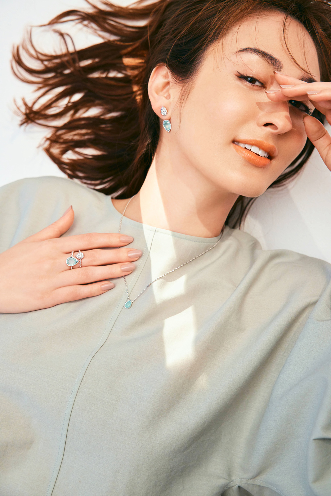 セルパンボエムシコレクションの新作として登場したアクアプレーズは、その絶妙な色彩とみずみずしい輝きが魅力。ピュアで軽やか、そして凛とした女性らしさを感じさせてくれるから、“初めてのセルパンボエム”にもぴったり。ホワイトゴールドのビーズで縁取られたドロップチーフやスネークの妖艶なうろこを思わせるリングのアームなど、伝統的な職人技を感じさせる地金の彫刻技術にもうっとり。