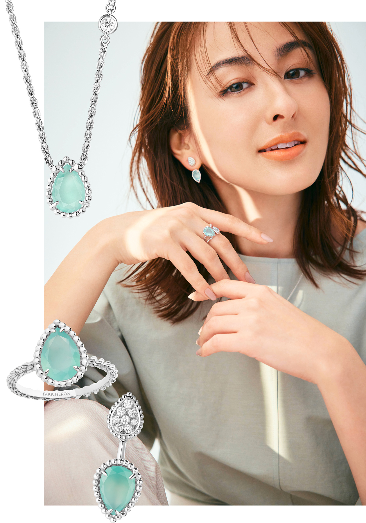 【静物】上から:ペンダント〈WG×アクアプレーズ×D〉¥224,400リング〈WG×アクアプレーズ〉¥265,100ピアス(片耳)〈WG×アクアプレーズ×D〉¥462,000すべて「セルパンボエム」(すべてブシュロン/ブシュロン クライアントサービス)