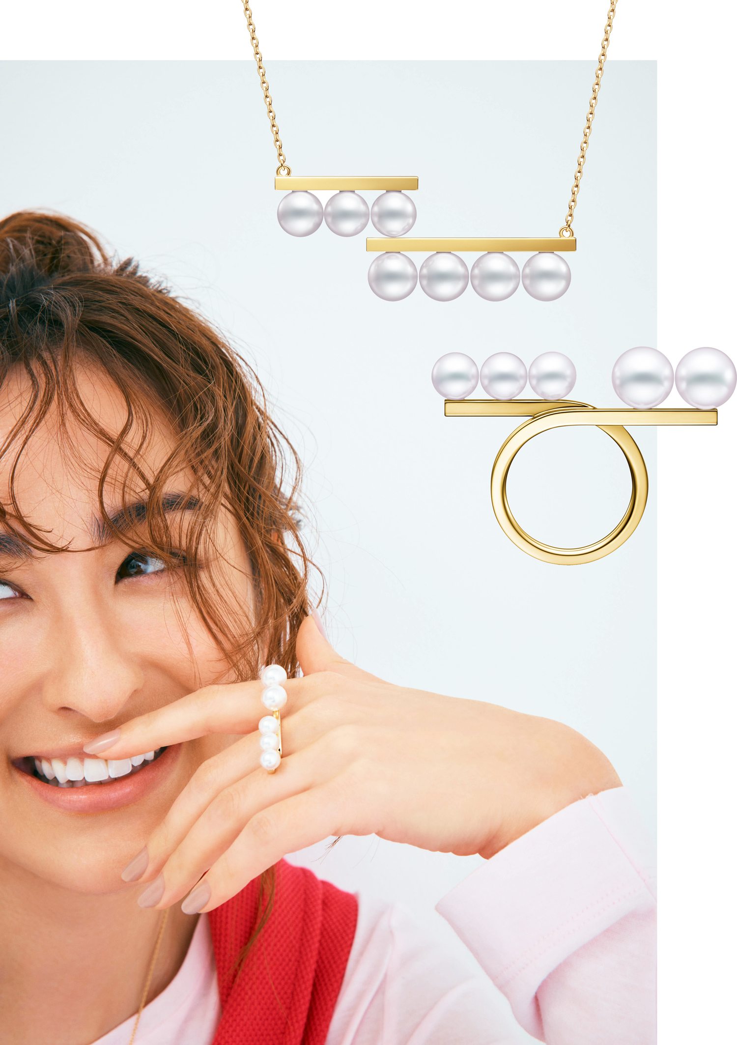 守りの印象が強いパールを、ポジティブでモダンな印象に昇華させた「バランス」シリーズ。新作として登場したのが、ステップ状になったバーにパールが端正に並ぶ「バランス ステップ」と、指を囲うようなバーのフォルムにサイズの異なるパールをセットした「バランス ループ」。直線的なモチーフとアシンメトリーな要素を組み合わせたデザインは、パールをフレッシュに楽しむのにぴったり!