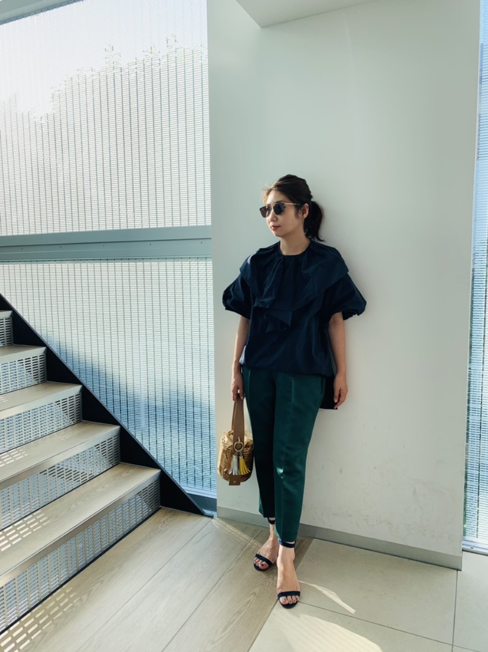 「夏のお出かけ、今年はワンピより主役を張れる一張羅ブラウスが気分!グリーンのパンツにちょこっとヒールでラクだけどきれいめ見えするコーデに。かごバッグとバーサンダルで夏気分を盛りました。たっぷりフリルの甘ブラウスを大人のバランスで着たいです。」
