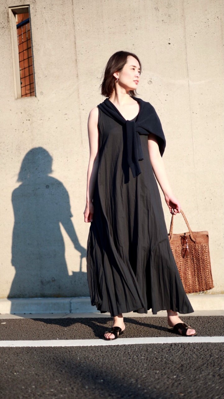「夏の黒が好きで、このMARIHAのワンピースはヘビロテアイテム。肩周りが華奢な体型なので、カーディガンを肩がけしてバランスをとっています。小物はカジュアルだけどきれい見えするものをチョイス。シンプルなワンピースですが、アクセサリーは盛り過ぎずピアスのみでさらっとまとめるのが好きです。」