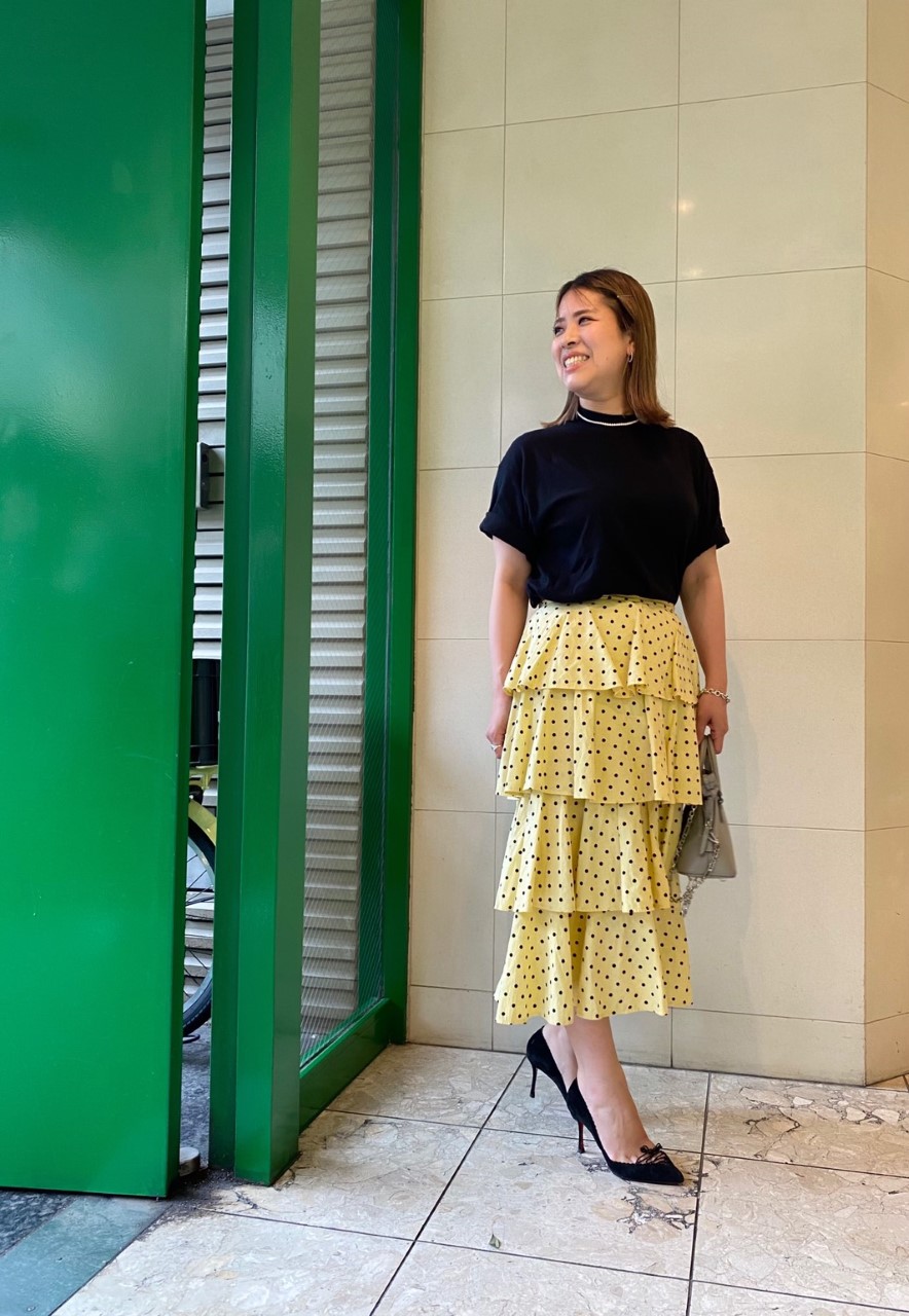 「私にとってTシャツは、基本的にコーデの“脇役的”存在。存在を主張しない脇役アイテムだからこそ選びにはこだわっています。へインズフォービオトープのTシャツはネックの詰まり具合や肩の落ち感など、細かいディテールがツボ。シンプルな形、かつメンズアイテムなので、必ず華やかなボトムスと合わせるのがマイルールです。靴やバッグなどの小物も女性らしいアイテムをチョイスしました」