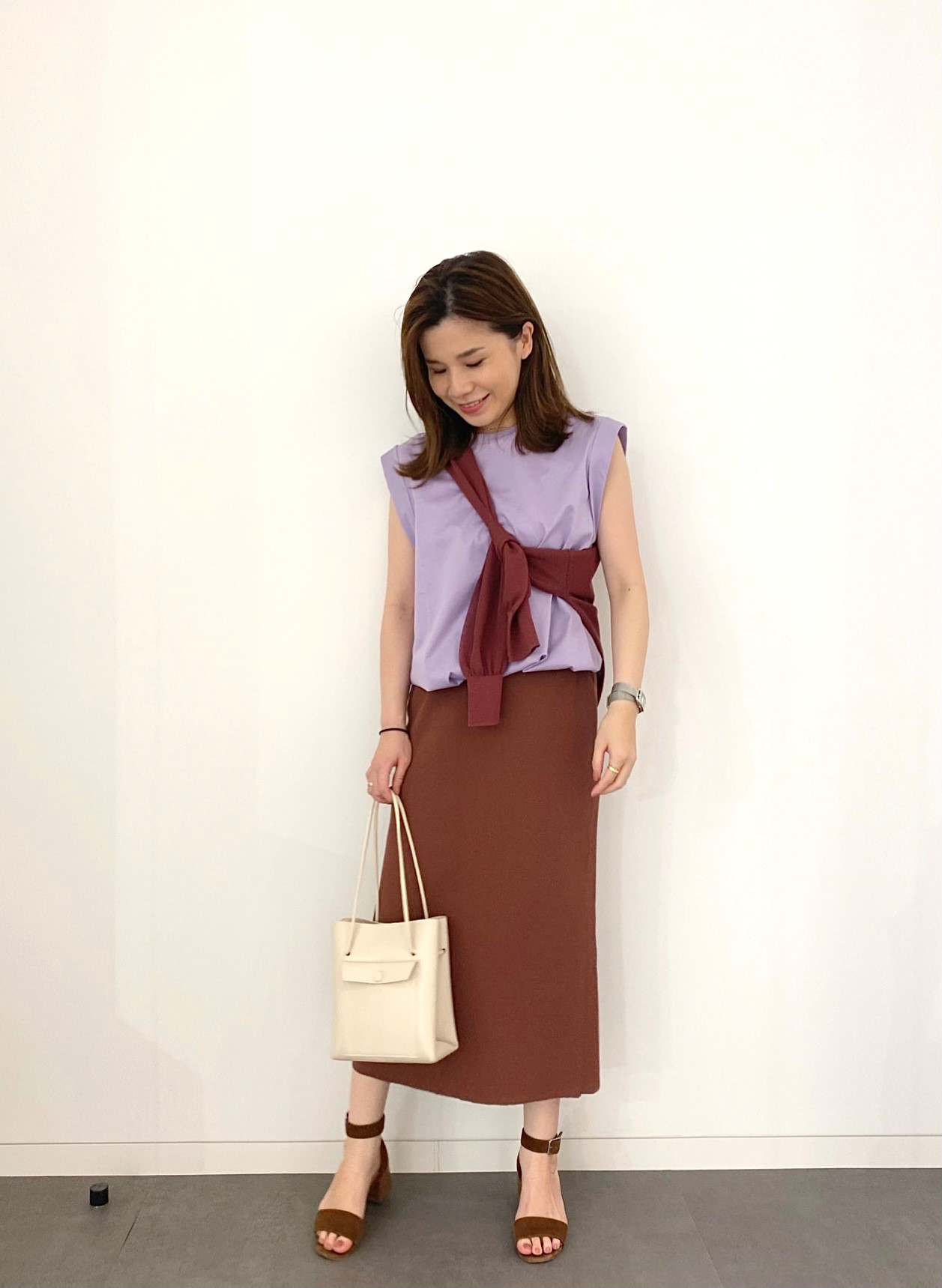 「同系色でまとめるとIライン効果ですっきり見えの効果が。普段もワントーンコーデは良く取り入れています。カーデのたすき掛けは視線を上げてくれるので、よく取り入れる技。アクセントにしたパープルも、ベースの色と同じ暖色系にすると、唐突な感じなく合わせられます」