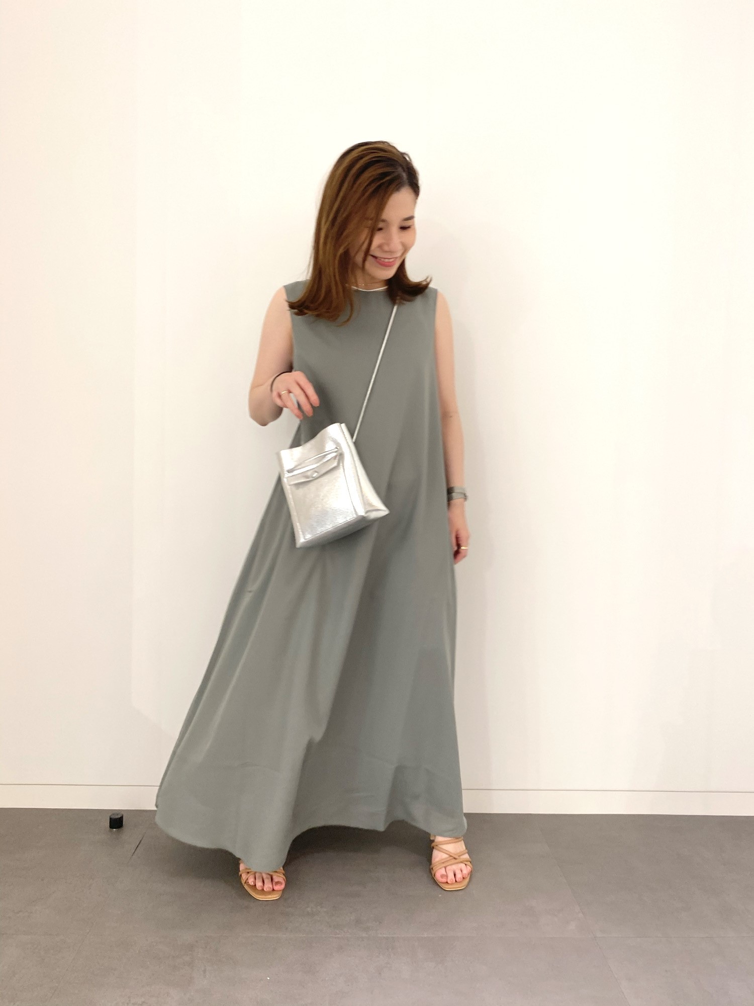 「くすみグリーンは、ロングワンピでも重たくなりすぎず、小柄な方でも着ていただきやすい一枚です。大人っぽい印象に仕上がる色も大事なポイント。お直し要らずの丈も嬉しいです。フロントはシンプルでAラインシルエットのワンピース、写真には映っていませんが、バックスタイルはV開きにリボンディティールで抜け感があるのも、スッキリと着こなせるポイント。シルバーのショルダーバッグで、少しくびれを作るイメージで、寸胴に見えないようにポイントを作っています」