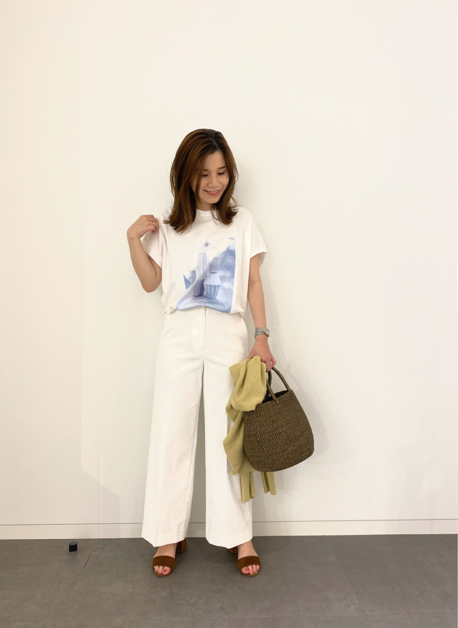 「毎年愛用しているPLSTの『リネンブレンドワイドパンツ』は、XXSサイズをお直しなしで履いています。小柄な人におすすめしたい一本。腰周りはフィットしているので広がりすぎず、カジュアルすぎないので小柄な方でもバランスが取りやすいです。ホワイトのワントーンで統一。カジュアルになりがちな夏のコーデ、(Tシャツ+ワイドパンツ)も白で統一するときれい見え(=大人っぽくみえる)ので良くする合わせ方です」