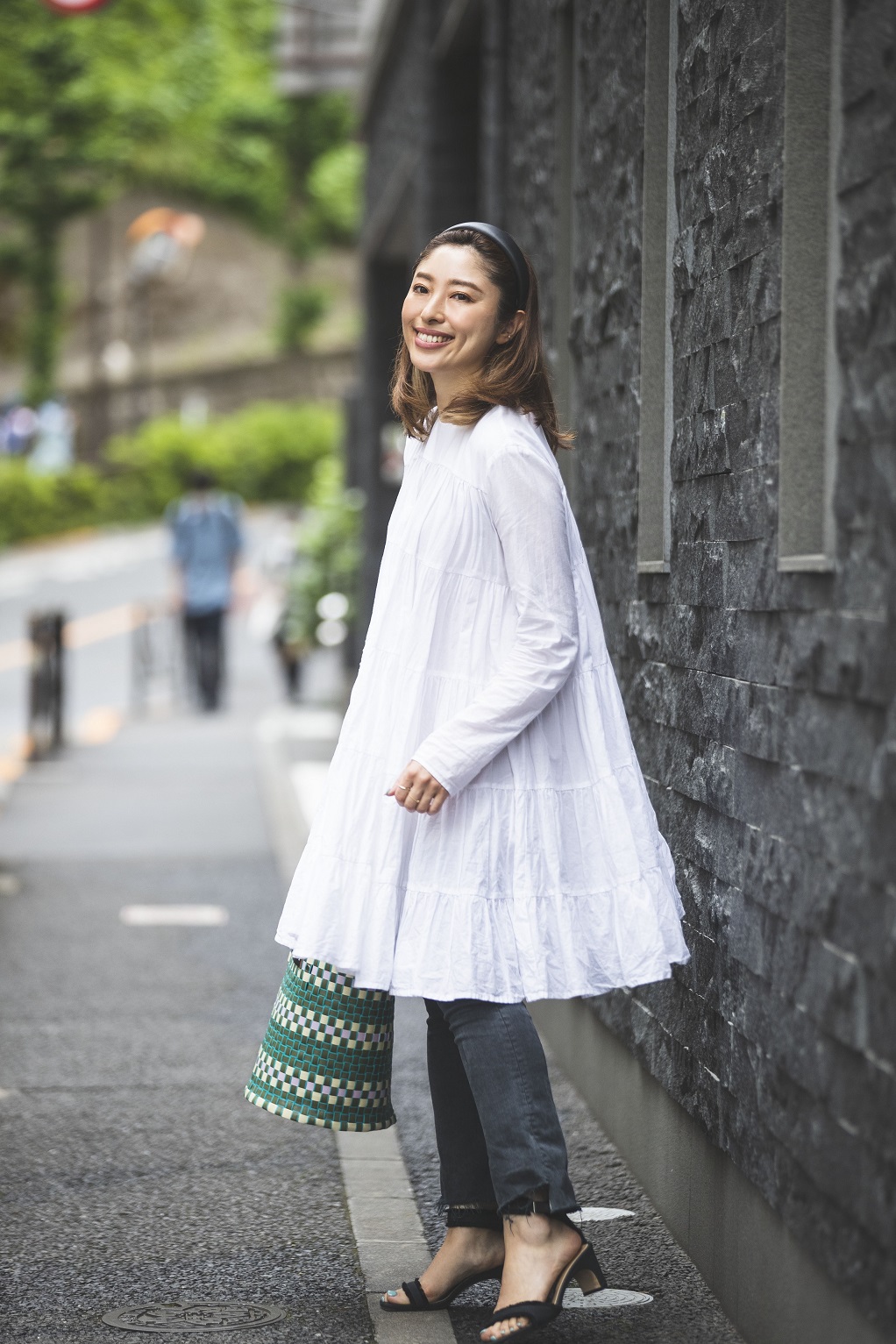 「マーレットのワンピはパンツ合わせでチュニックっぽく着るのが定番です。ティアードシルエットが甘すぎにならないように、カットオフデニムで少しだけカジュアル具合をMIX。
