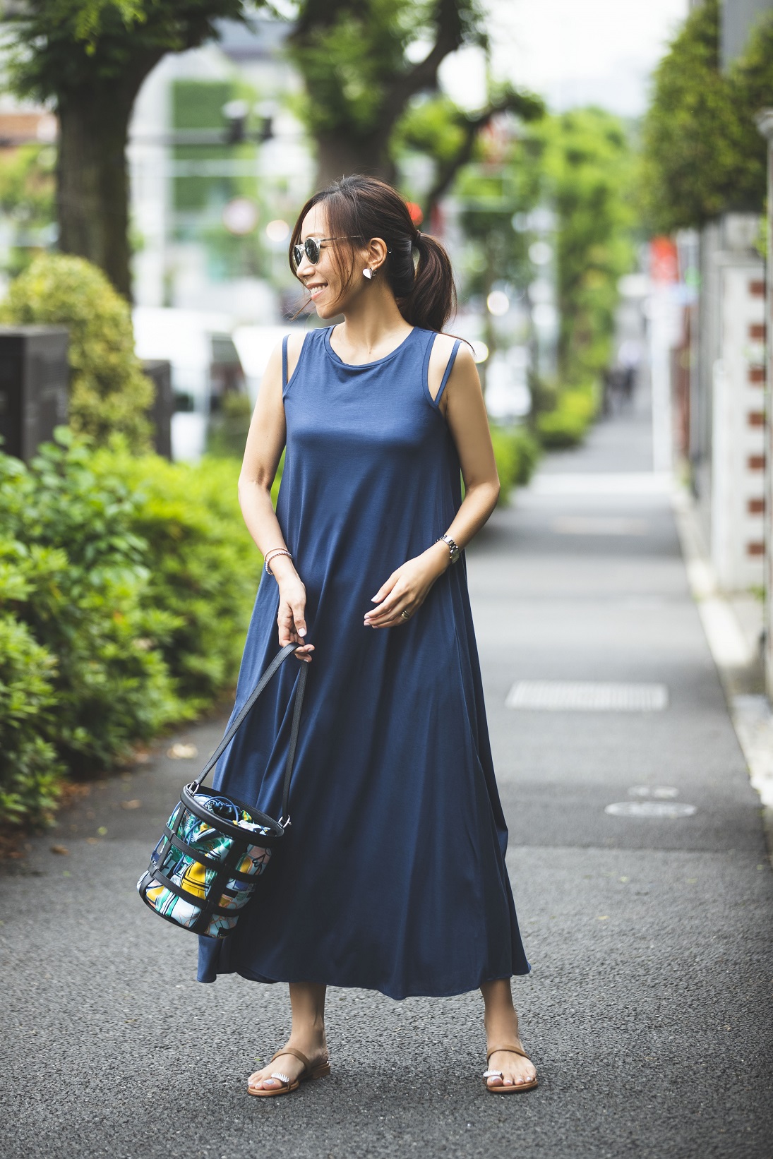 「暑い夏は週3ワンピ!肩ストラップのデザインが印象的なサヤカデイビスのロングワンピースは、シックなブルーが気に入ってロンハーマンで購入しました。少しくすんだようなニュアンスカラーが大人の肌に丁度良く、肩のデザインも二の腕や肩の丸みをさり気なくカバーしてくれる気がします。ワンピースがカットソー素材なのでラフになりすぎないようコンサバなバッグを合わせました」