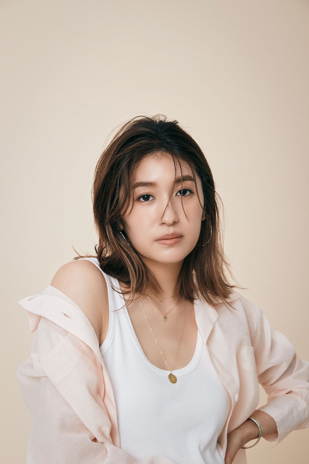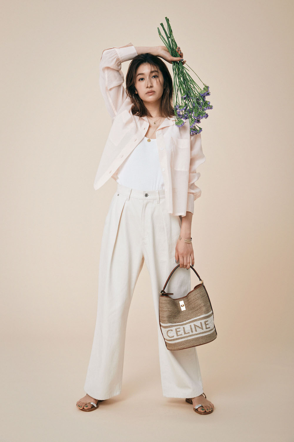 シアーシャツ¥8,800(リーバイス®/リーバイ・ストラウス ジャパン)コットンタンク¥7,700(TW/LYDIA)タックワイドパンツ¥20,900(ETRÉ TOKYO)フラットサンダル¥30,800(イル サンダロ オブ カプリ/ビームス 公式オンラインショップ)ピアス¥121,000イニシャルネックレス¥63,800スクエアプレートネックレス¥68,200ロングコインネックレス¥126,500バングル¥148,500ターコイズリング¥79,200(すべてGIGI/ホワイトオフィス)