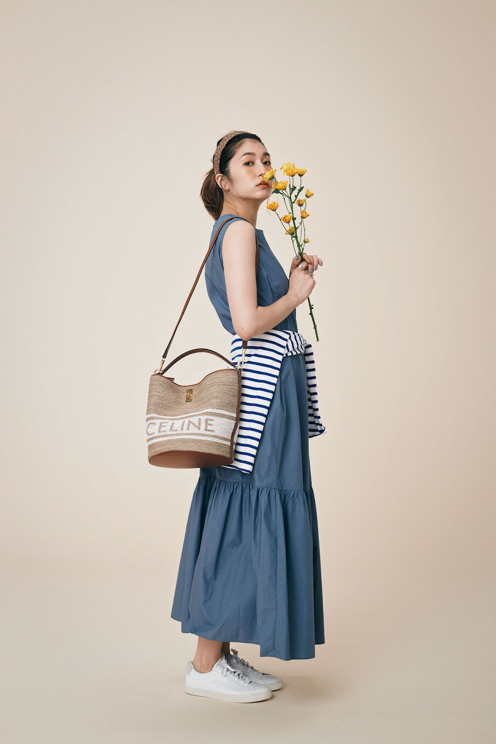 夏の装いに欠かせないティアードワンピース。爽やかなブルーのボーダーやクリーンな白スニーカーでカジュアルにアレンジした着こなしに、軽やかなテキスタイルのバッグを合わせれば、さらに夏気分が盛り上がる大人マリンなムードに。付属のショルダーストラップを付ければハンズフリーにもなるから、アクティブに動きたいシチュエーションにも適任。