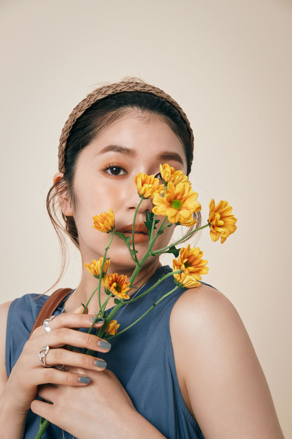 ニュアンスカラーの着こなしに夏らしいアクセントを